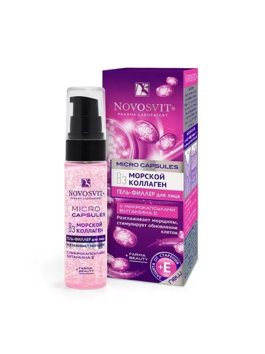 Гель - филлер для лица NOVOSVIT Морской коллаген, разглаживает морщины, 30 мл. Гель - филлер для лица 'Морской коллаген' - эффективное омолаживающее средство. Он способствует разглаживанию морщин, усиливает регенерацию и стимулирует обновление клеток. Благодаря активизации фибробластов, кожа интенсивнее вырабатывает коллаген - главный фактор молодости кожи.. комплекс с морским коллагеном и ниацинамидом микрокапсулы с витамином Е интенсивное увлажнение способствует выработке коллагена придает коже свежий вид и естественное сияние легкая текстура. Небольшое количество геля (1 - 2 нажатия достаточно для лица и шеи) нанесите на чистую кожу утром и вечером, избегая области вокруг глаз. Гель - филлер создает на коже слегка липкую текстуру, 'усаживается на коже', через 60 секунд липкость проходит. Возможно легкое покалывание и покраснение. Рекомендуем сочетать гель - филлер с кремом (или маской). Срок годности: 24; Состав: Aqua (Water), Soluble Collagen, Biosaccharide Gum - I, Betaine, Mannitol, Cellulose, Tocopheryl Acetate, Hydroxypropyl Methylcellulose, Niacinamide, PEG - 40 Hydrogenated Castor Oil, Hydroxyethyl Аcrylate\Sodium Аcryloyldimethyltaurate Сopolymer, Ammonium Acryloyldimethyltaurate\VP Copolymer, Disodium EDTA, Methylisothiazolinone, Methylchloroisothiazolinone, Parfum, Benzyl Alcohol, Benzyl Salicylate, Hexyl Cinnamal, Hydroxyisohexyl 3 - Cyclohexene Carboxaldehyde, Linalool, СI 14720; Объем: 30; Область использования: Лицо; Тип кожи: Для зрелой кожи;