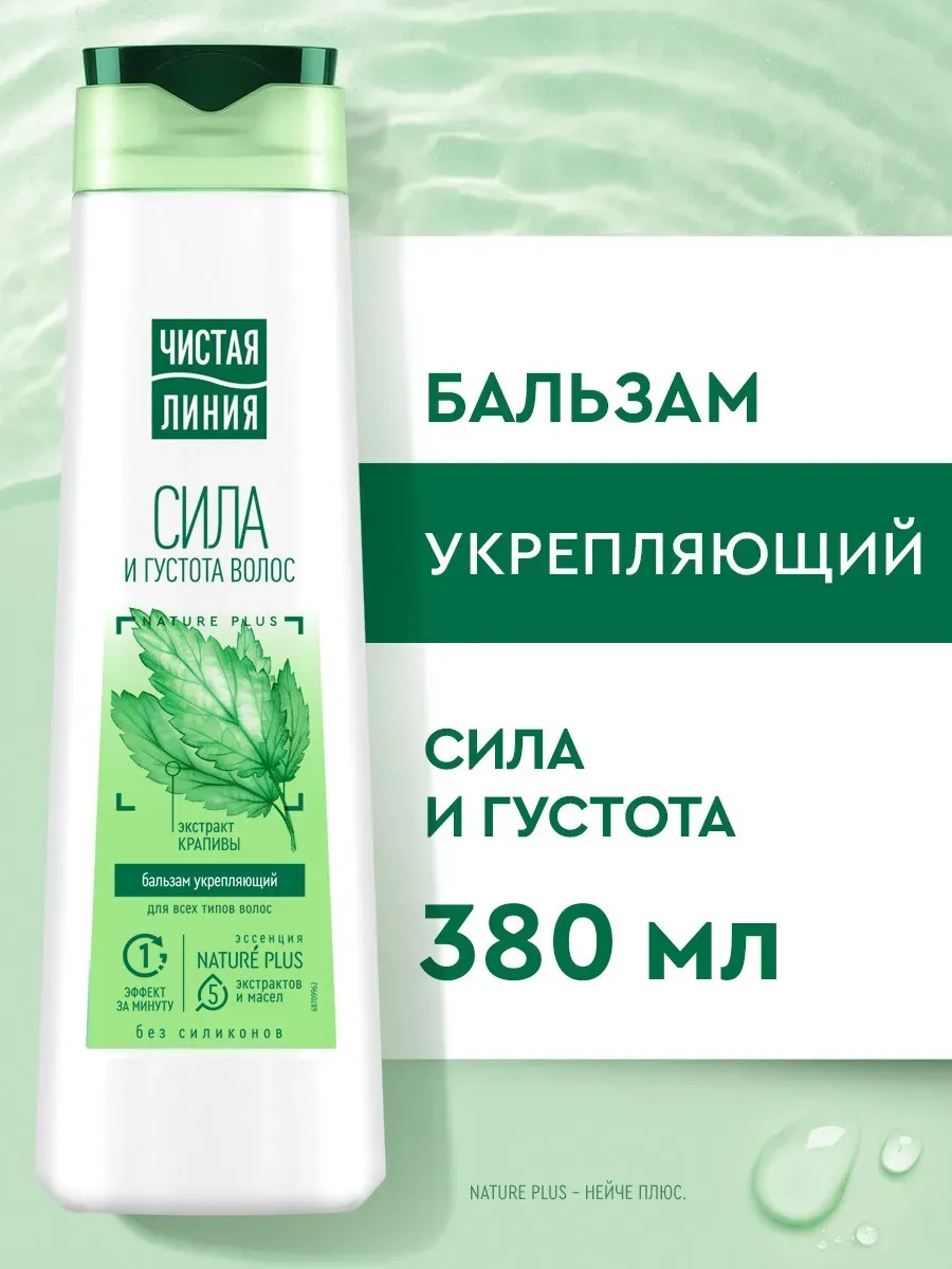 Бальзам-ополаскиватель Крапива Чистая Линия создан, чтобы волосы вновь стали красивыми, густыми и сильными. Бальзам для волос не содержит силиконов и на 97% состоит из компонентов натурального происхождения. Отлично подходит для всех типов волос. Эссенция 5 Nature Plus – НЕЙЧЕ ПЛЮС содержит 5 тщательно отобранных по своим свойствам экстрактов и масел, предупреждает выпадение, питает и защищает волосы от повреждений. -Экстракт вербены обладает успокаивающим, общеукрепляющим действием. -Шалфей способствует питанию кожи головы, укреплению и росту волос*. -Экстракт шиповника, богатый витаминами и известный своими восстанавливающими свойствами, стимулирует рост волос*. -Масло льна питает, смягчает кожу и волосы. -Миндальное масло восстанавливает секрецию и придает здоровый блеск. -Крапива укрепляет волосы по всей длине. -Молочко овса разглаживает и восстанавливает их структуру без эффекта жирности и утяжеления. В сочетании с ингредиентами бальзама.