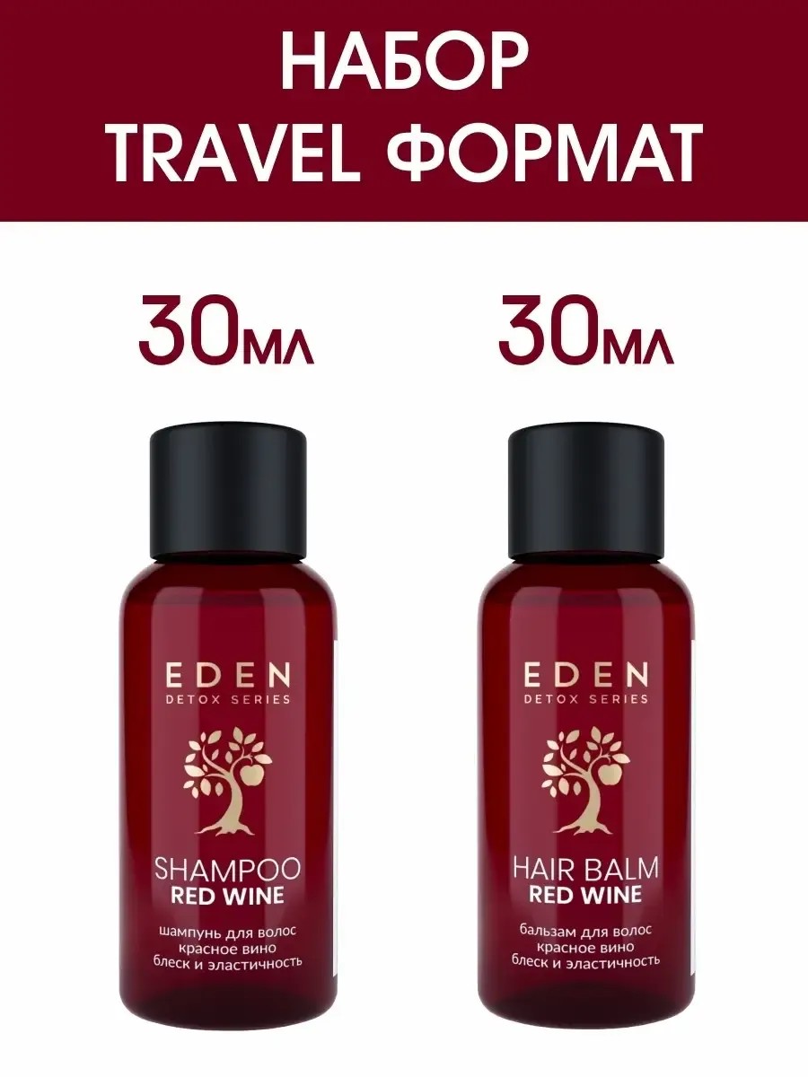 Набор косметический TRAVEL формат шампунь Red Wine 30мл+бальзам Red Wine 30мл идеальный вариант для путешествий. Шампунь и бальзам DETOX RED WINE -экстракт красного вина обеспечивает антиоксидантный эффект, снижает ломкость и придает блеск. Янтарная кислота благотворно влияет на кожу головы, улучшая обменные процессы в клетках, активизирует рост волос. Масла кокоса, ши, виноградной косточки смягчают, питают и увлажняют волосы, делая их мягкими и блестящими.