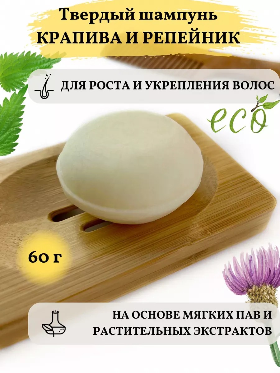 Твердый шампунь от выпадения волос, роста, для мягкого очищения и укрепления «Крапива и Репейник». Натуральный шампунь не содержит консервантов, парабенов, красителей и синтетических отдушек. Бережно очищает волосы и кожу головы, так как в основе шампуня мягкие и растительные ПАВы. Экономичен в использовании, заменяет 300 мл жидкого шампуня. Эко шампунь богат на содержание активных растительных компонентов: экстракты крапивы и лопуха-проникают в кутикулу волоса, укрепляют изнутри, наделяют здоровым блеском. Экстракт розмарина и репейное масло нормализуют кровообращение кожи головы, стимулируют спящие фолликулы, что способствует активному росту волос. Лактат натрия в комплексе с инулином и БТМС(воском растительного происхождения) обеспечивают мягкий кондиционирующий эффект- разглаживают волосы, облегчают расчесывание. За аромат отвечает композиция эфирных масел нероли, бергамота и грейпфрута. Универсальный твердый шампунь для волос мужской и женский, подходит для всех типов кожи головы и волос. Твердый шампунь для жирных волос отлично очищает, нормализует выработку кожного сала.Твердый шампунь для роста волос подходит для сухих , нормальных, окрашенных, вьющихся и тонких волос. Твердый шампунь удобно брать с собой в дорогу, в отпуск, в бассейн, в спортзал благодаря компактным размерам.