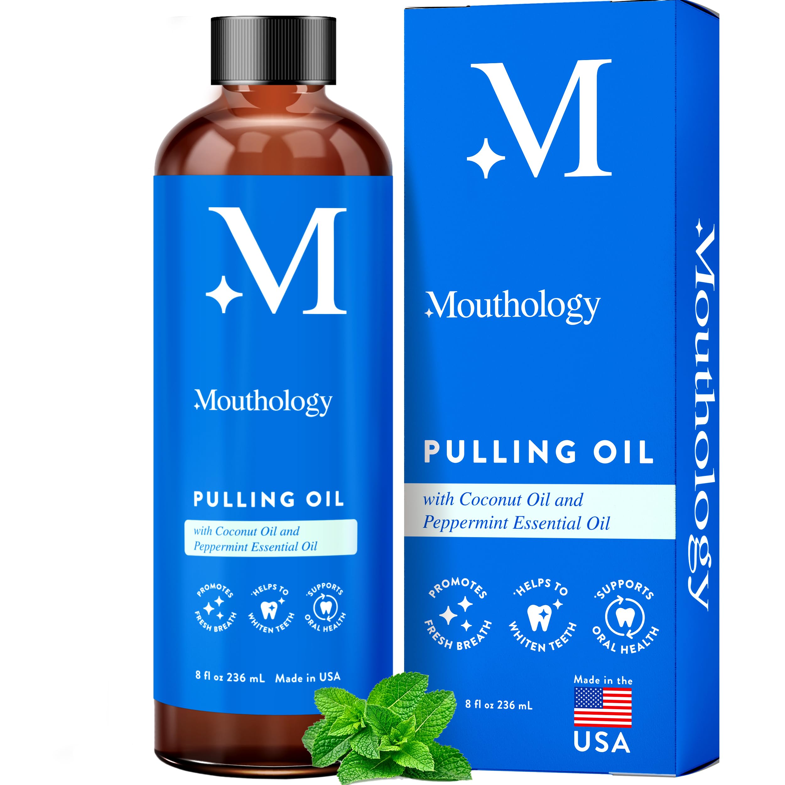 MADE IN USA - We take oral health and the quality of our products seriously. Our American-owned and operated business proudly and responsibly source and manufacture our coconut pulling oil here in the USA in a clean and safe facility. Contact our friendly US-based team if you have any questions about your oil pulling regimen or if we can assist along your journey of improved mouth care. AYURVEDIC, HOLISTIC ORAL CARE - Coconut pulling oil for mouth gum health is an experience you won't find with traditional mouthwashes that are littered with ingredients that not only fail to improve teeth and gum health.they may even do the opposite. IMPROVE GUM HEALTH CAVITY PREVENTION - White teeth and fresh breath are great, but more importantly we need to protect and enhance our oral health from cavities and more serious issues. Daily coconut oil pulling does what teeth brushing, flossing and traditional mouthwashes cannot. FRESH BREATH - Tired of bad breath? Oil pulling for teeth and gums is a holistic and powerful way to get to the root of bad breath. Coconut pulling oil extracts and cleans bad breath culprits from your teeth, tongue and gums, leaving you with minty fresh breath. TEETH WHITENING PULLING OIL - Start and end your day with our advanced Mouthology Coconut Oil Pulling for teeth whitening formula. Made of just two ingredients from Nature, Fractionated Coconut Oil and Peppermint Essential Oil, enjoy 8 fl oz. of healthy and effective teeth whitening mouthwash.