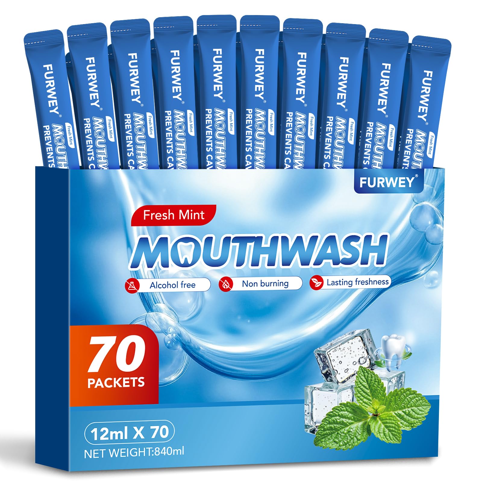 Can be used 70 times:Each package contains 70 individually packaged mouthwashes.This travel mouthwash is applicable for multiple scenarios including traveling,dating, parties and all the other situations that you need mouthwashes. Effective protection:FURWEY travel mouthwash is also effective in preventing cavities.It is a good partner for maintaining overall oral health, no matter where you are. Long-lasting Fresh Breath:This mouthwash combats bad breath germs,ensuring fresh and clean breath after every use.Enjoy fresh mint flavor. minty flavour and keeps your fresh breath for 24 hours. Alcohol Fluoride Free:This mouthwash is alcohol and fluoride free.Food-grade ingredients and not irritating to the mouth. Easy to carry:FUREWY Travel Mouthwash is packaged individually, and its small size makes it very convenient to carry. You can put it in your carry-on luggage or pocket to ensure fresh breath at all times.