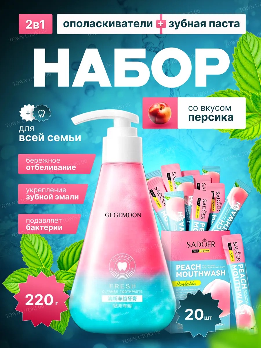 Зубная паста ополаскиватель для полости рта нежный персик и зубную пасту с дозатором.
