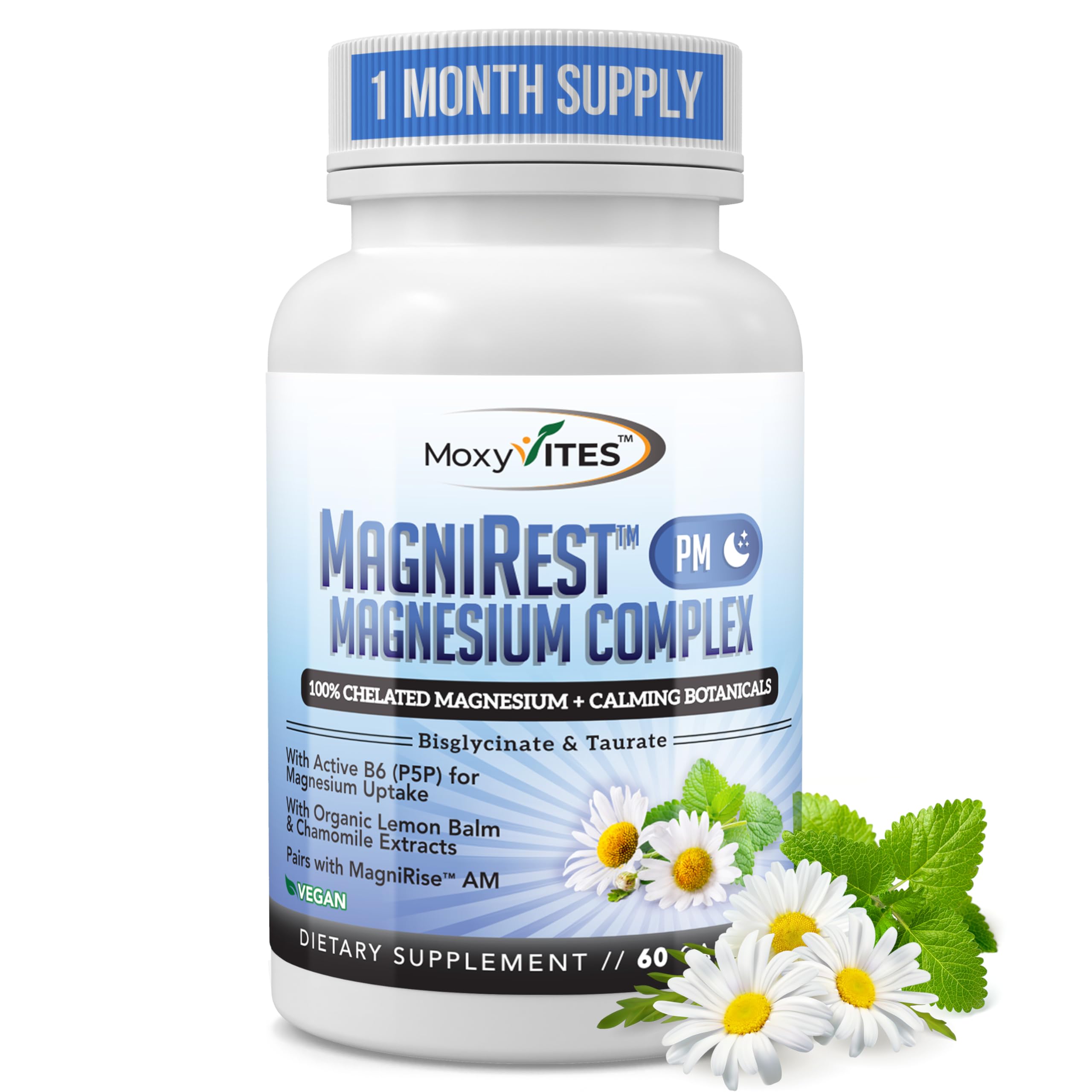 MoxyVites MagniRest PM Magnesium Complex for Women & Men - Magnesium Bisglycinate, Taurate, Active B6, & Calming Organic Botanicals - Chelated High Absorption - Nighttime Magnesium, 60 Vegan Capsules 60 Count (Pack of 1)