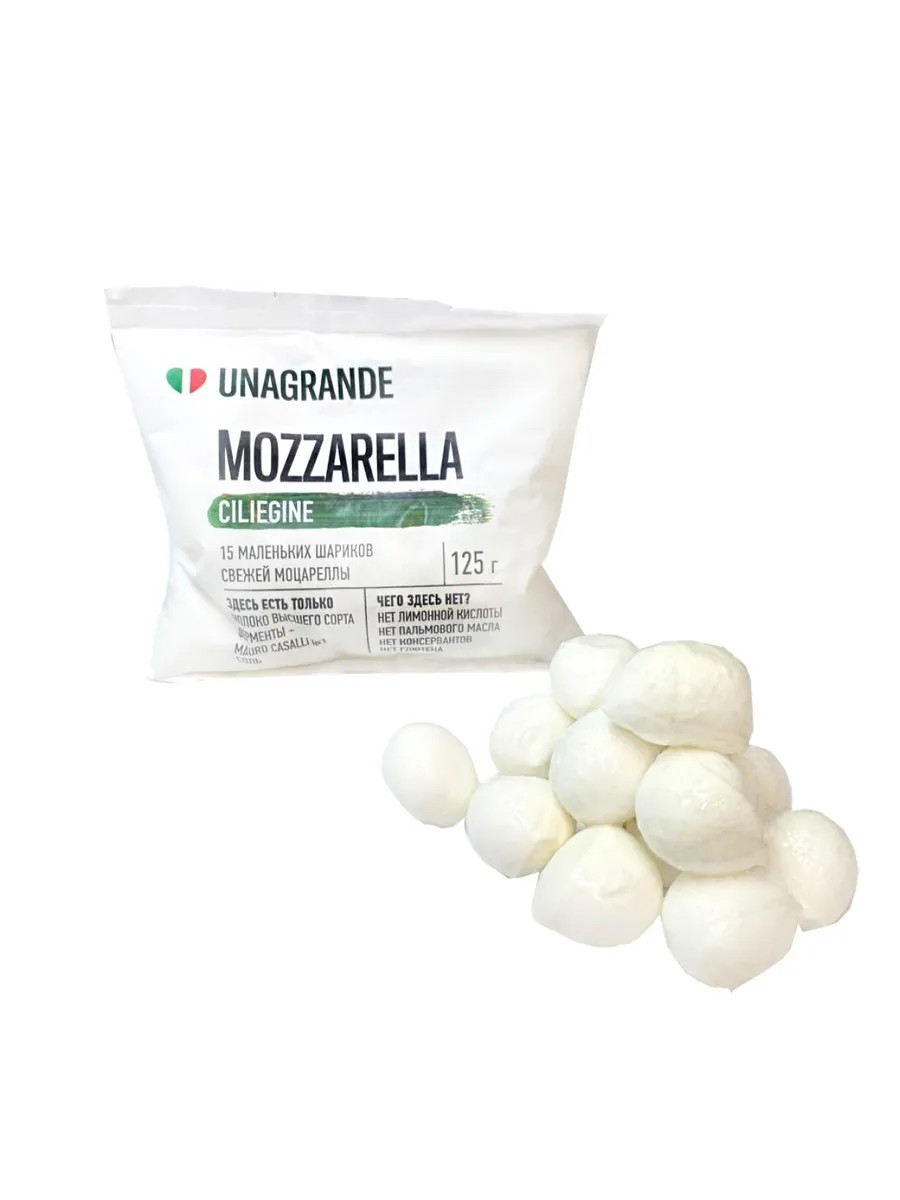 Моцарелла чильеджина производится компанией Unagrande, которая специализируется на качественном сыре, приготовленном только из натуральных ингредиентов по классической итальянской рецептуре. Продукт не содержит лактозы. В упаковке находятся нежные маленькие шарики со слоистой текстурой и сливочным вкусом.