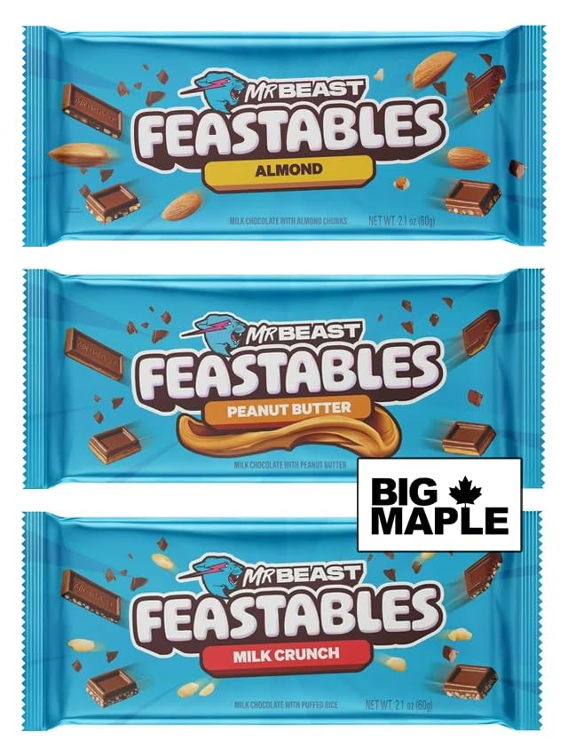 Indulge in the new and improved Feastables MrBeast Milk Chocolate Candy bars, crafted with a reformulated recipe for a richer and more delectable flavor experience. Feastables is on a mission to change the way you snack. We've created delicious snacks with ingredients you can trust. Founded by Mr. Beast (aka Jimmy Donaldson), our chocolate will not only level up your day, but it will leave you wondering how you can get your hands on more. Blended to make a smooth, creamy and delicious chocolate candy. Feastables bars will melt in your mouth with every bite. Enjoy these three different flavours (almond, peanut butter and milk crunch). They are perfect for a quick snack, school lunch, at the office, road trips or enjoying at the movies.PERFECT ANYTIME: Feast like a beast and share the chocolate candy bars with family and friends! Perfect for Christmas stockings, Halloween candy bags, Valentine's Day, Easter baskets, or just a mid-day sweet treat. FUN TRIVIA: Enjoy the BIG MAPLE Trivia Cards and learn some interesting new facts about a variety of topics. THREE FLAVOURS: Almond, Peanut Butter and Milk Crunch. Why choose one, when you can have all three?. BUNDLE INCLUSION: A total of three Mr. Beast Chocolate Candy Bars (60g per) with BIG MAPLE Trivia Cards.