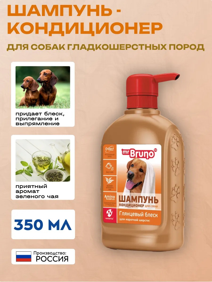 Шампунь для собак Mr.Bruno "Глянцевый блеск" объемом 350 мл предназначен для собак с гладкой структурой шерсти любого возраста.
