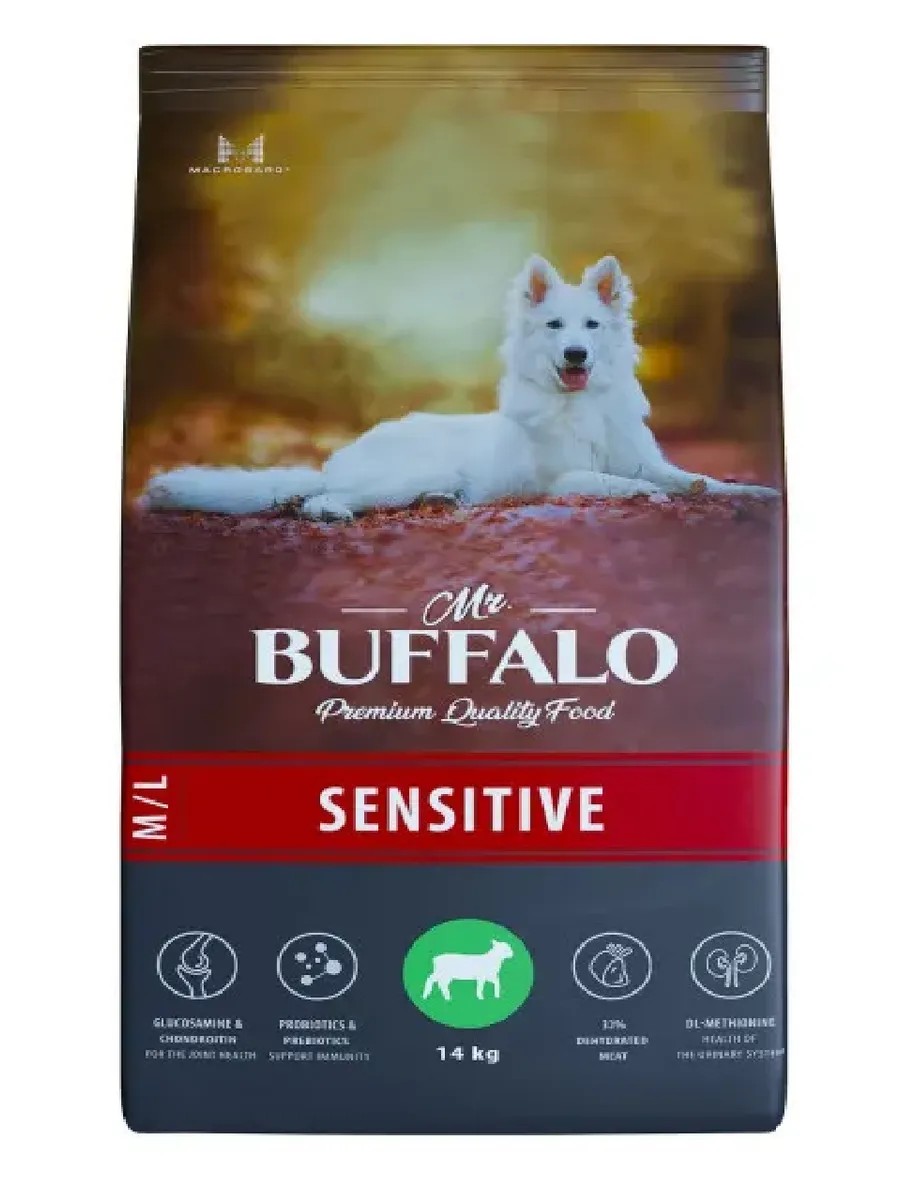 Mr.BUFFALO, Сухой корм для собак средних и крупных пород Ягненок, 14 кг. Полнорационный сухой корм Mr.Buffalo SENSITIVE с ягнёнком для взрослых собак всех пород с чувствительным пищеварением. Основу рациона составляет мясо ягнёнка и рис, обладающие низким аллергенным потенциалом, легко перевариваются, снижая нагрузку на пищеварительный тракт. Увеличенное содержание Омега-3 и Омега-6 жирных кислот помогает эффективно бороться с основными симптомами аллергии и пищевой непереносимости: снижает зуд от расчёсов, убирает покраснения кожи, снимает воспаление глаз, ушей, останавливает неконтролируемую линьку. Одним из ключевых компонентов сухого корма Mr. Buffalo является уникальная запатентованная добавка бета-глюкан, которая является натуральным иммуностимулятором. Бета-глюкан активизирует естественные функции организма кошек, помогает им бороться с инфекциями, поддерживает здоровое пищеварение, повышает сопротивляемость организма к бактериям, вирусам, грибкам и понижает риск различных заболеваний.