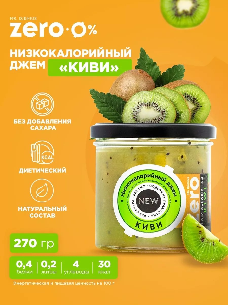 Delicious low-calorie kiwi jam (270g) from Mr. Djemius ZERO, a renowned sports and diet nutrition brand. It boasts a natural and rich flavor. A special kiwi processing technology preserves its vitamins, trace elements, and minerals. It has a sweet, but not cloying, taste. An ideal choice for those who adhere to a healthy diet. Mr. Djemius ZERO low-calorie kiwi jam (270g) has a thick and delicate texture. It spreads easily on bread and toast. It pairs well with cottage cheese, porridge, and baked goods. The manufacturer does not use sugar or GMOs. This product contains a minimal number of calories. It helps reduce the calorie content of your diet and will not harm your figure or diet. The calorie content of Mr. Djemius ZERO jam is only 30 kcal per 100 grams. Lose weight without sacrificing your favorite delicious foods. Kiwi contains a special enzyme, actinidin, which improves digestive function.