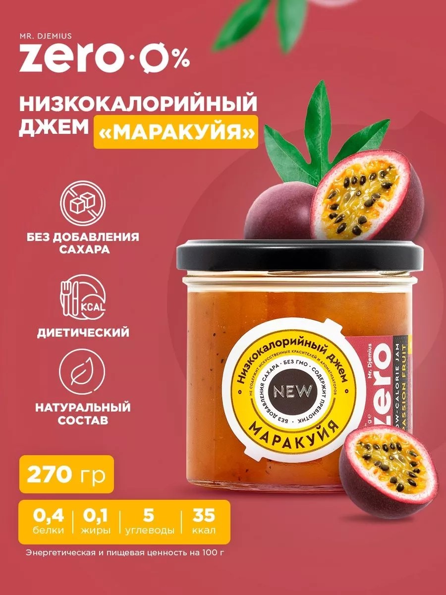 Вкусный и питательный джем с минимальным количеством калорий в составе и вкусом маракуйя. Продукт известного производителя спортивного и диетического питания Mr.Djemius ZERO. Создан с использованием натуральных и экологически чистых компонентов. Специальная технология производства сохранила в составе низкокалорийного джема витамины, микроэлементы и минеральные вещества.Mr.Djemius ZERO низкокалорийный джем 270 г Маракуйя не содержит ГМО и сахара. Помогает снизить калорийность рациона питания. Лучшая альтернатива для традиционных джемов с большим количеством сахара в составе. Не вредит фигуре и подходит для употребления людям, которые придерживаются диеты.Сбалансированное содержание белков, жиров и углеводов. Джем сочетается с кашами, творогом и выпечкой. Помогает перекусить и быстро утолить голод. Начинайте утро с низкокалорийного джема, чтобы зарядиться энергией. Оптимальный вариант для профессиональных спортсменов, а также приверженцев здорового образа жизни.