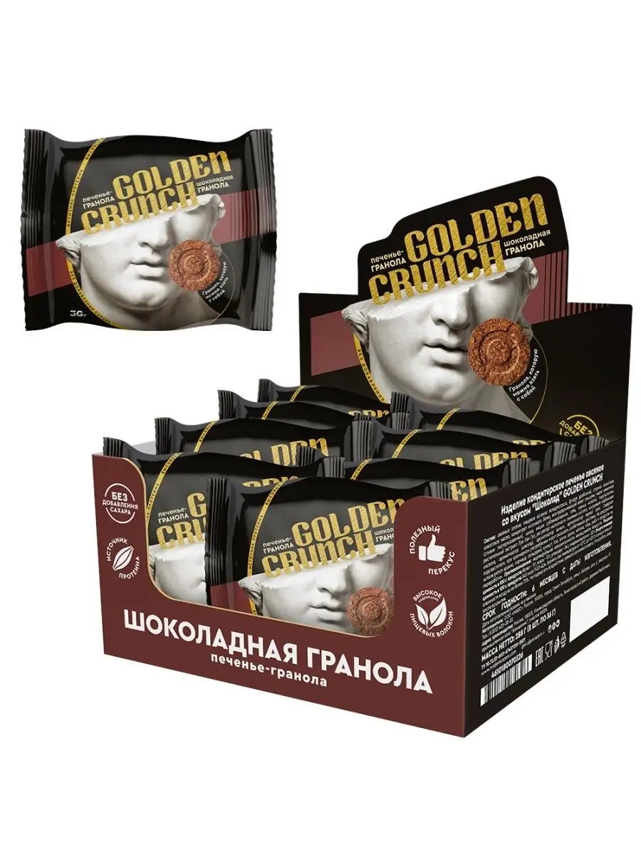 Golden Crunch содержит протеин, пребиотики и пищевые волокна. Эти ингредиенты оказывают положительное воздействие на работу желудочно-кишечного тракта,в составе отсутствуют ГМО и сахар, поэтому печенье-гранола отлично подойдет для сторонников полезного питания и ЗОЖ, спортсменов, тех, кто на диете, и следит за свои здоровьем. Шоколад с гранолой - это вкус, поднимающий настроение.