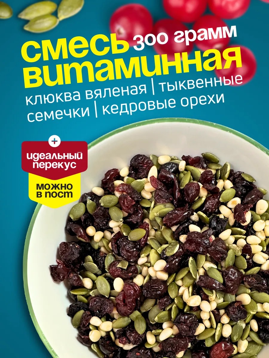 Откройте для себя невероятный вкус и пользу с нашей витаминной смесью из кедрового ореха, тыквенных семечек и клюквы весом 300 грамм! Эта уникальная смесь орехов и семян идеально подходит для тех, кто стремится к здоровому питанию и хочет обогатить свой рацион полезными веществами.