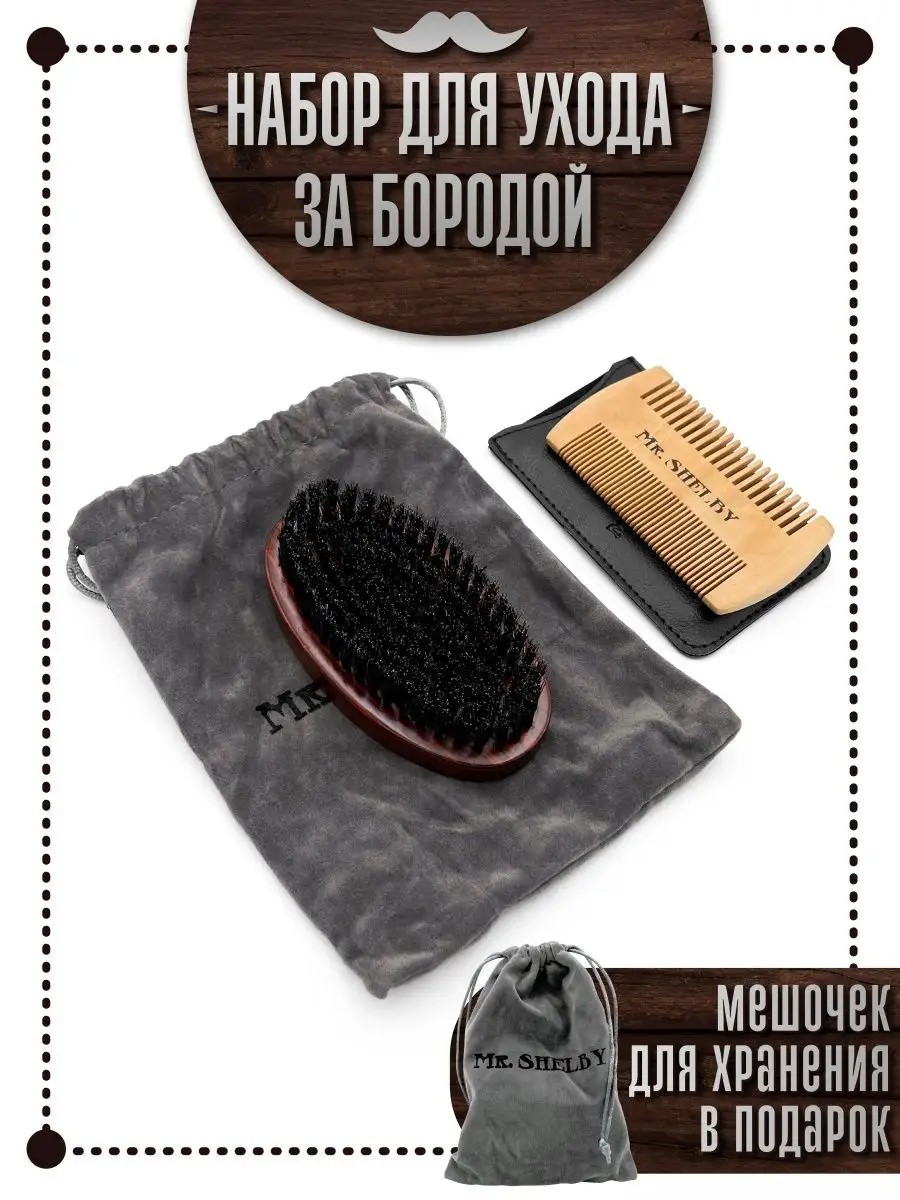 Барбер подарочный набор - идеальный подарок мужчине (брату, мужу, дедушке и тд) ! В комплекте: деревянная щетка для бороды из натуральной щетины кабана, гребень, чехол для гребня из премиум ЭКОкожи и мешочек для хранения всех принадлежностей. ВНИМАНИЕ!!! Перед применением щетки необходимо пройтись по ней рукой либо массажной расческой, чтобы отпали все не закрепившиеся щетинки! Мягкая щеточка для не травмирует волоски, задает им правильное положение, легко распутывает волосы, не вызывая аллергии, снимает зуд кожи. Расчесываясь щеточкой, вы получите легкий сухой массаж, который будет улучшать кровообращение, питая волосяные луковицы, стимулируя рост сильных волос. В стильном мешочке можно взять все с собой и придать бороде нужную форму в любой момент. Советуем не мыть изделие под водой. Для очистки щетины лучше протирать ее влажной тканью или мимолетно прополоснуть под струёй воды, затем обязательно просушить вдали от источников тепла. Отлично подойдет в качестве сюрприза любимому парню, папе и другому вашему другу бородачу. Расческа для мужика на др день рождения. Оригинальный товар порадует каждого! Наши качественные продукты обеспечивают легкое нанесение бальзама, масла или воска, а также равномерное распределение средства по всей длине. Комплект уходовой косметики для бритья на 14 или 23 февраля, 1 сентября, новый год, день отца.