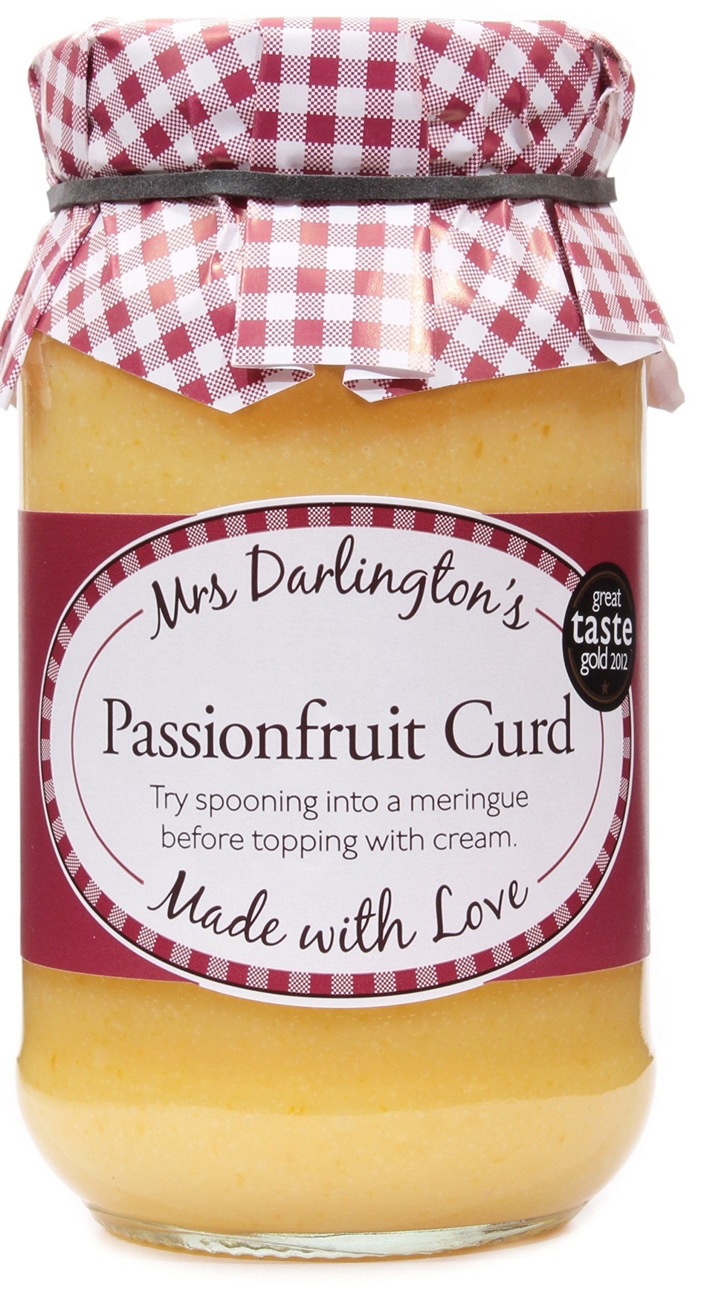 Mrs. Darlington's Passionfruit Curd INGREDIENTS Sugar, pasteurized whole egg, margarine (vegetable oils, water, salt, emulsifier E475, natural colorants - annatto, curcumin, natural flavorings), juice (concentrate) 24 , citric acid.