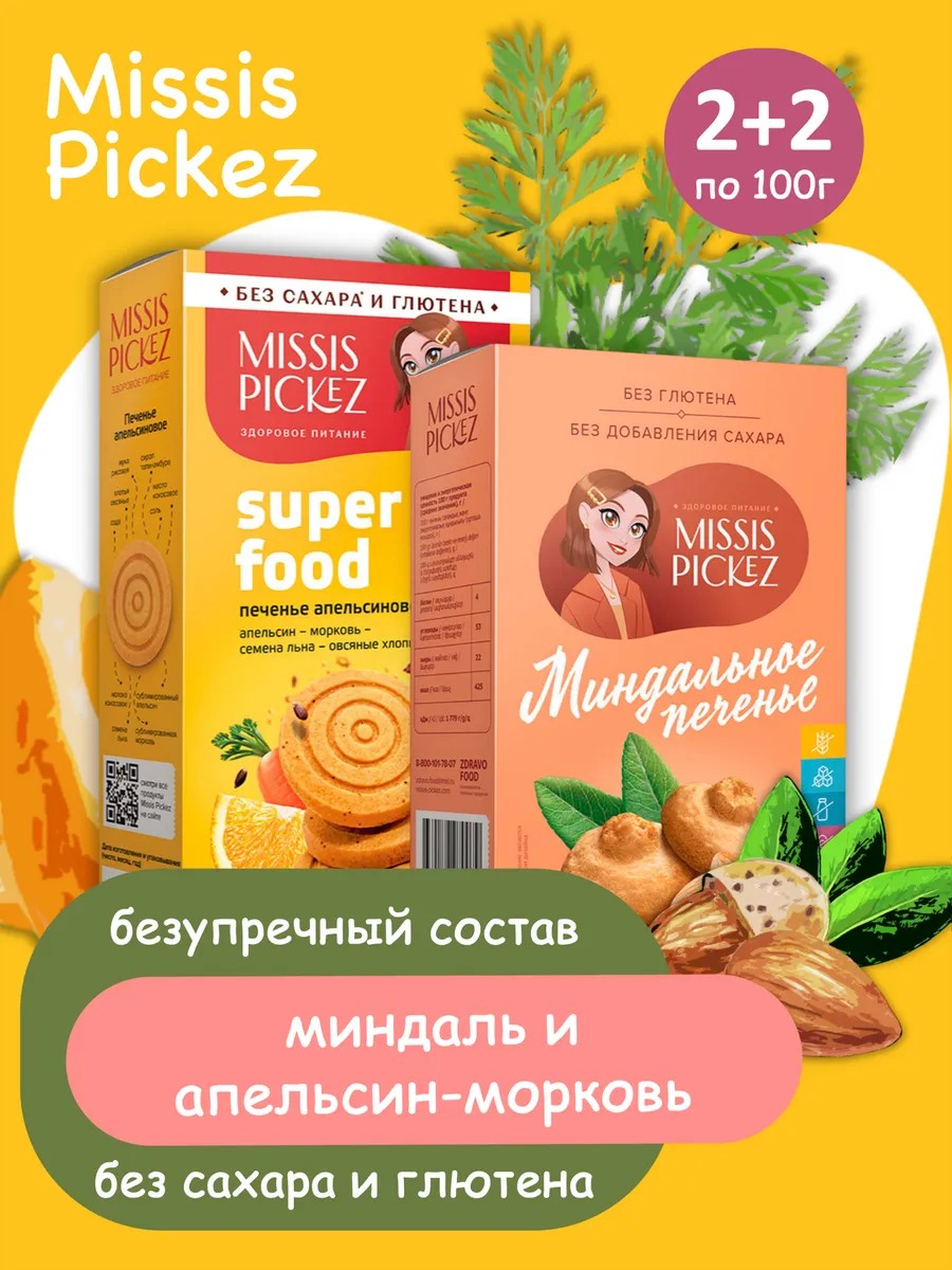 | Комплектация | Миндальное печенье, 100 гр - 2 уп; Апельсиновое печенье с морковью и семенами льна, 100 гр - 2 уп |