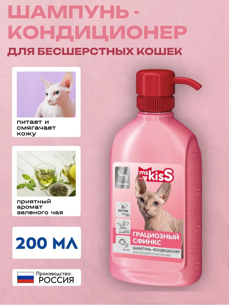 Шампунь-кондиционер Ms.Kiss Грациозный сфинкс специально разработан для ухода за нежной и чувствительной кожей бесшерстных кошек.