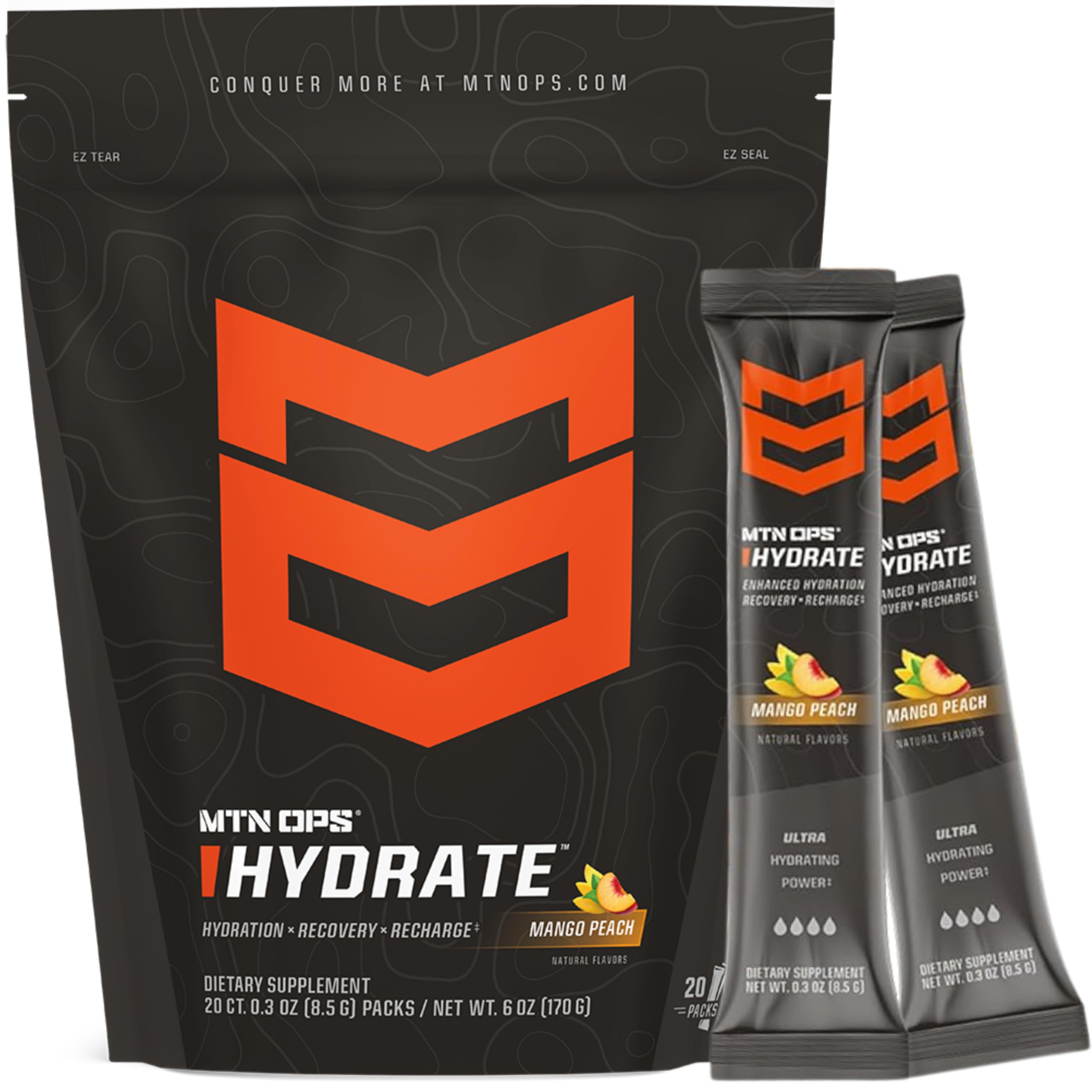 DIRECTIONS — MIX HYDRATE DAILY - Stir 1 scoop into 8–12 oz of water and enjoy anytime you need fast hydration — morning, during workouts, or throughout active days. For intense training or hot conditions, take an additional serving to help replenish electrolytes. GLUTEN-FREE FORMULA FOR CLEAN DAILY HYDRATION - Hydrate is made without gluten or wheat ingredients, delivering fast-absorbing electrolytes and minerals you can trust — perfect for athletes with gluten sensitivities or anyone choosing clean hydration support. SUGAR-FREE HYDRATION SOLUTION – Enjoy clean hydration without the added sugar or unnecessary calories. Perfect for active lifestyles, MTN OPS Hydrate fits seamlessly into your fitness or outdoor routine. FAST-ABSORBING ELECTROLYTES POWDER – Designed for optimal absorption, MTN OPS Hydrate ensures your body efficiently utilizes nutrients, so you stay hydrated and perform at your best. BALANCES FLUIDS PREVENTS CRAMPING – With key electrolytes and zero sugar, this hydration drink helps regulate fluid levels, reducing the risk of dehydration, muscle cramps, and fatigue for sustained energy. SUPPORTS PEAK PHYSICAL PERFORMANCE – Replenish lost electrolytes like potassium, sodium, and magnesium with this hydration powder, designed to keep muscles functioning properly and prevent fatigue during intense workouts or outdoor adventures. ELECTROLYTE POWDER FOR ENHANCED HYDRATION – MTN OPS Hydrate delivers a powerful blend of essential electrolytes, vitamins, and minerals to boost hydration and performance, whether you're at the gym, on the trails, or tackling everyday activities.