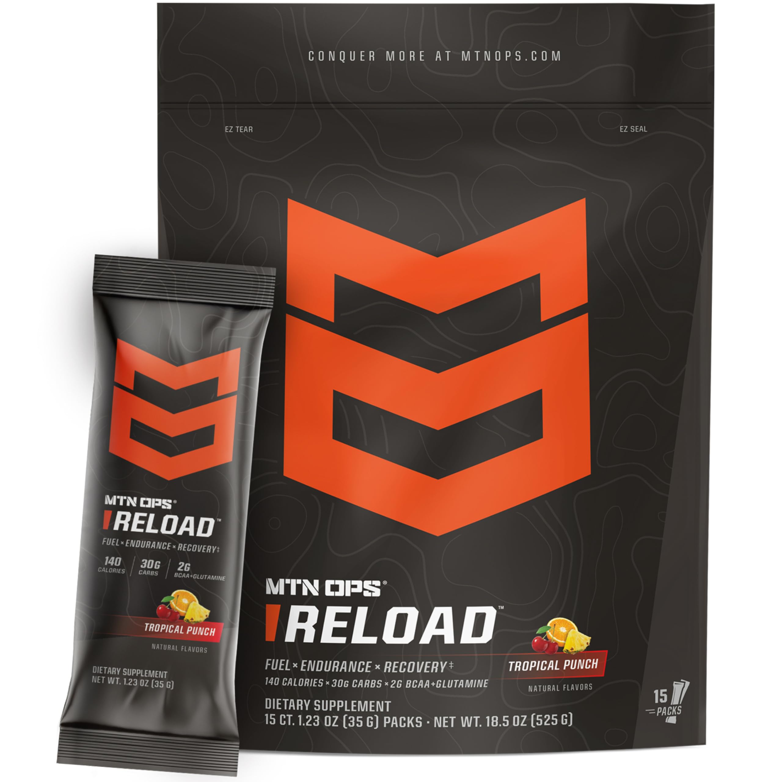 MTN OPS Reload Ready-to-Mix Carb Mix 30g Fast-Digesting Carbohydrates MCT Oil Powder & BCAAs Energy & Endurance Single-Serve Stick Packs 15 Servings Tropical Punch