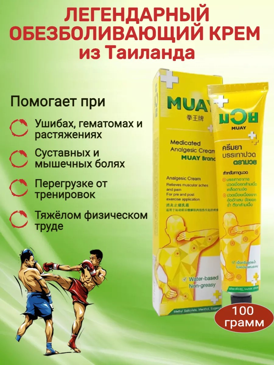 Обезболивающая разогревающая мазь-анальгетик широко используется среди спортсменов и рекомендуется спортивными врачами Таиланда и тренерами тайского бокса Муай-Тай. Крем-бальзам Muay используется повсеместно перед серьезными поединками или тяжелыми долговременными турнирами в качестве поддерживающего и разогревающего средства для мышц спортсменов, как защищающее средство для связок, предотвращающее растяжение и разрывы, для подготовки к поединку наиболее часто травмируемых частей тела. - - Подготавливает тело к физическим нагрузкам и расслабляет напряженные мышцы- - Обеспечивает облегчение боли в сухожилиях и суставах- - Быстро впитывается и не липнет - - Идеально подходит для спортсменов и пожилых людей - - Помогает при ревматических заболеваниях и артрите - - Для всех видов спорта!
