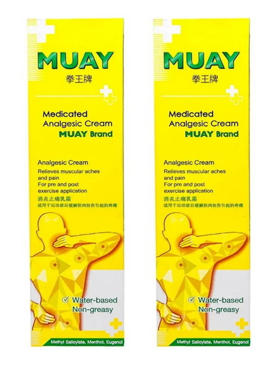 Muay, мазь разогревающая и обезболивающая Namman Analgesic Cream, 100гр, 2 шт. Тайский обезболивающий крем Namman Muay весьма популярен среди спортсменов всех стран. Является прекрасным заживляющим и восстанавливающим средством при ушибах, растяжениях связок, вывихах и других травмах, полученных в ходе спортивных состязаний и тренировок. Это обусловливает его широкое использование спортивными врачами и тренерами. Изначально свое применение тайский спортивный крем Namman Muay получил в среде бойцов Муай Тай (тайский бокс), где наиболее вероятно получение болезненных травм. Его выпустила в 1960 году компания Devakam – одна из основательниц знаменитого боксерского клуба King Pet. Клуб дал дорогу в большой спорт многим тайским боксерам, получившим впоследствии мировую известность. Крем для тела и спорта Namman Muay и был задуман изначально этой компанией как разогревающее перед боем средство для бойцов этой категории, позволяющее выдерживать им тяжелые удары и травмы. Способ применения: Тайский обезболивающий крем для спортсменов Намман Муай рекомендуется втирать круговыми массирующими движениями в пораженную область 2 – 3 раза в день. Место нанесения должно быть предварительно очищено от грязи и высушено. Втирать необходимо до полного высыхания. Перед спортивными состязаниями надо натирать тело препаратом для разогрева. Это повышает тонус мышц, снижает порог болевых ощущений. Для снижения остроты симптомов простуды нужно нанести крем для тела и спорта Namman Muay на грудь, спину, помассировать крылья носа. После использования руки надо тщательно вымыть с мылом.