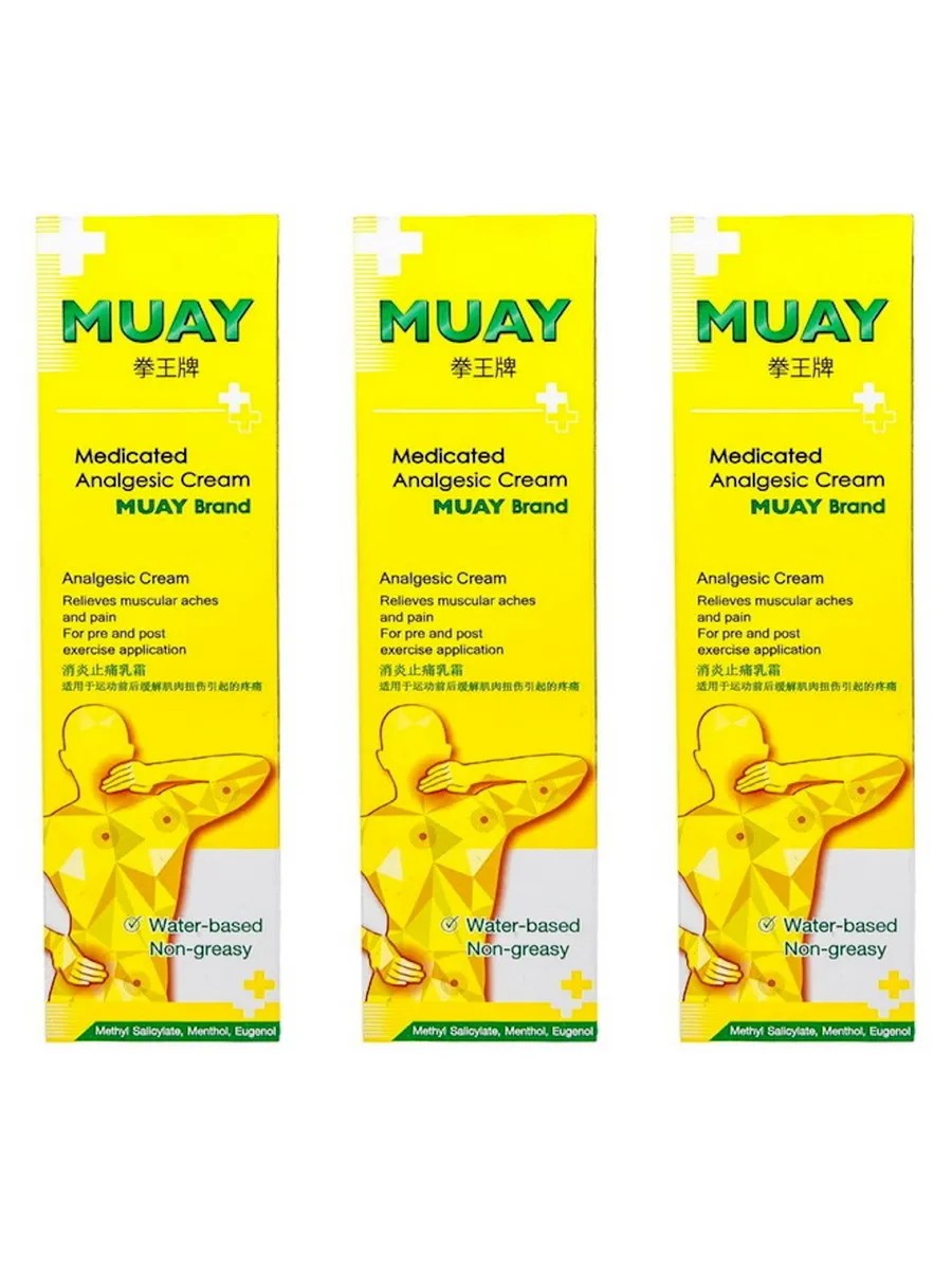 Muay, warming and pain-relieving ointment Namman Analgesic Cream, 100g, 3 pcs. Thai pain-relieving cream Namman Muay is very popular among athletes from all over the world. It is an excellent healing and restorative remedy for bruises, sprains, dislocations, and other injuries sustained during sports competitions and training. This explains its widespread use by sports doctors and trainers. Namman Muay Thai sports cream was initially used by Muay Thai (Thai boxing) fighters, who are most likely to suffer painful injuries. It was released in 1960 by Devakam, one of the founders of the famous King Pet boxing club. The club gave rise to the sport for many Thai boxers who later gained worldwide fame. Namman Muay body and sports cream was originally conceived by this company as a pre-fight warm-up product for fighters in this category, allowing them to withstand heavy blows and injuries. Directions for use: Namman Muay Thai Pain Relief Cream for Athletes is recommended to be rubbed into the affected area using circular massaging movements 2-3 times daily. The application area should be cleaned of dirt and dried. Rub in until completely dry. Before sports competitions, rub the body with the warm-up cream. This improves muscle tone and reduces pain. To reduce the severity of cold symptoms, apply Namman Muay body and sports cream to the chest and back, and massage the sides of the nose. After use, wash your hands thoroughly with soap.