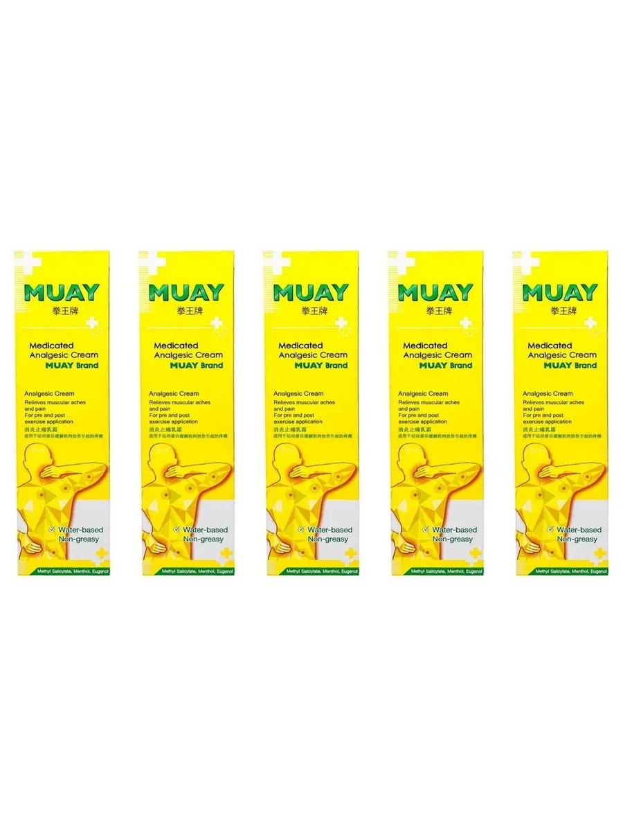 Muay, warming and pain-relieving ointment Namman Analgesic Cream, 100g, 5 pcs. Thai pain-relieving cream Namman Muay is very popular among athletes from all over the world. It is an excellent healing and restorative remedy for bruises, sprains, dislocations, and other injuries sustained during sports competitions and training. This explains its widespread use by sports doctors and trainers. Namman Muay Thai sports cream was initially used by Muay Thai (Thai boxing) fighters, who are most likely to suffer painful injuries. It was released in 1960 by Devakam, one of the founders of the famous King Pet boxing club. The club gave rise to the sport for many Thai boxers who later gained worldwide fame. Namman Muay body and sports cream was originally conceived by this company as a pre-fight warm-up product for fighters in this category, allowing them to withstand heavy blows and injuries. Directions for use: Namman Muay Thai Pain Relief Cream for Athletes is recommended to be rubbed into the affected area using circular massaging movements 2-3 times daily. The application area should be cleaned of dirt and dried. Rub in until completely dry. Before sports competitions, rub the body with the warm-up cream. This improves muscle tone and reduces pain. To reduce the severity of cold symptoms, apply Namman Muay body and sports cream to the chest and back, and massage the sides of the nose. After use, wash your hands thoroughly with soap.