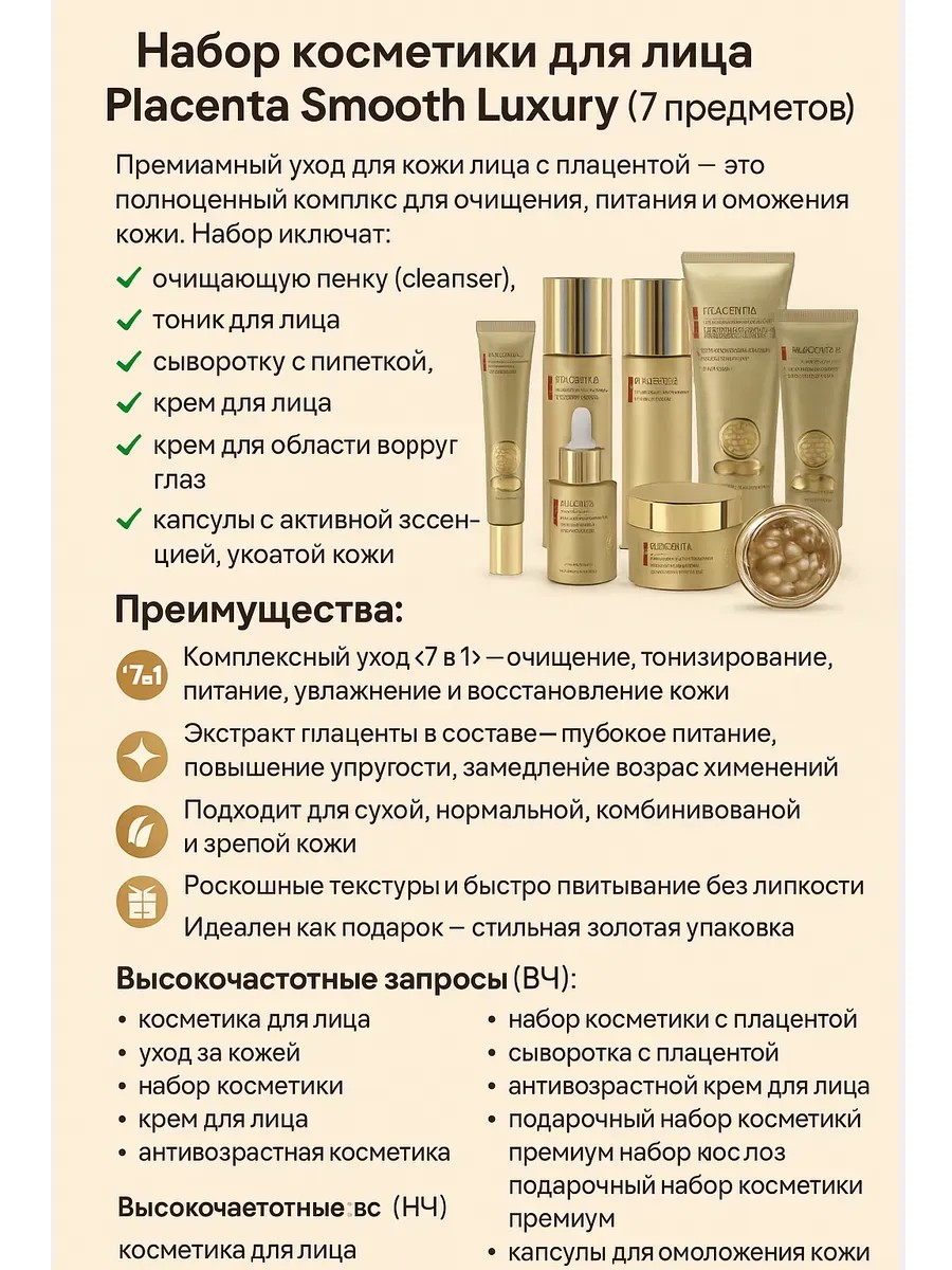 Премиальный уход для кожи лица с плацентой — это полноценный комплекс для очищения, питания и омоложения кожи. Набор включает: