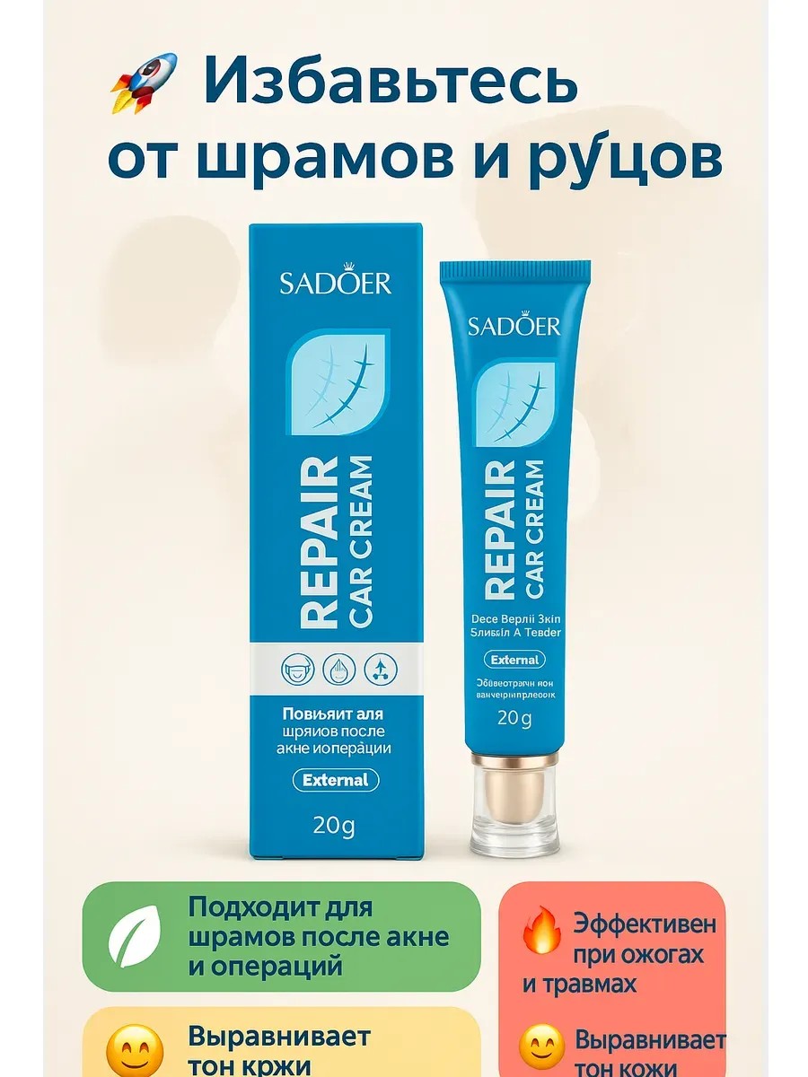 SADOER Repair Scar Cream (20 г) – эффективный крем для восстановления кожи и уменьшения рубцов. Лёгкая текстура быстро впитывается, не оставляет жирного блеска, подходит для лица и тела.