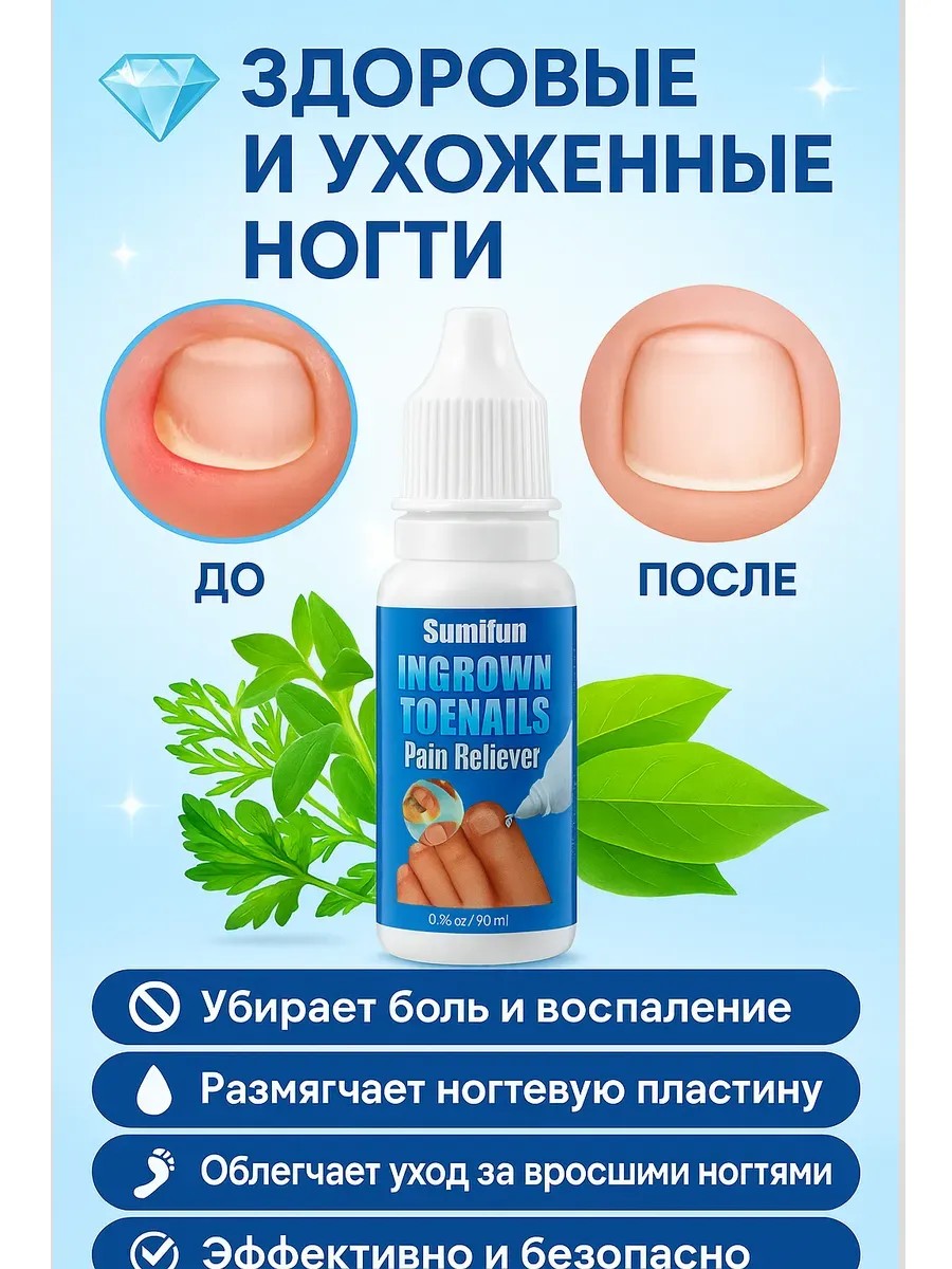 Эффективное средство для ухода за ногтями при проблеме вросших ногтей. Жидкость Sumifun Ingrown Toenails помогает снять боль, уменьшить воспаление и размягчить ногтевую пластину, облегчая процесс коррекции. Подходит для женщин и мужчин, удобна для применения в домашних условиях.