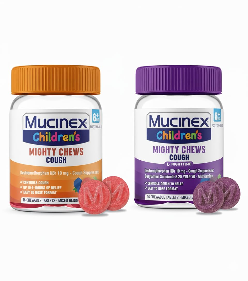 MUCINEX CHILDREN'S COUGH MEDICINE: Mucinex Children's Mighty Chews are formulated for children 6 years of age and older When your child is sick, give them real medicine for real symptom relief. BIG RELIEF FOR YOUR LITTLE ONE: Mucinex Children's Mighty Chews Cough mixed berry flavor chewable tablets are free of alcohol and acetaminophen. MAXIMUM STRENGTH KIDS COUGH MEDICINE FOR DAY OR NIGHT: Mucinex Children's Mighty Chews Nighttime helps relieve runny nose reduces the impulse to cough to help your child get to sleep. REAL MEDICINE: Mucinex Children's Mighty Chews contain real active ingredients to help your child feel better Dextromethorphan HBr is a cough suppressant Doxylamine Succinate (night tablets only) is an antihistamine. CONVENIENT KIDS COUGH RELIEF: Mucinex Children's Mighty Chews provide fuss-free cough relief and are perfect while on-the-go. SAY GOODBYE TO MESSY COUGH SYRUP: Our unique, kid-friendly Mighty Chews are easy to dose and mess-free cough suppressant chews that provide powerful cough relief for your child for up to 4 hours. MIGHTY, EASY, CHEWABLE COUGH MEDICINE FOR KIDS: Introducing new Mucinex Children's Mighty Chews - the first and only medicated cough relief chewable tablets made with kids in mind.