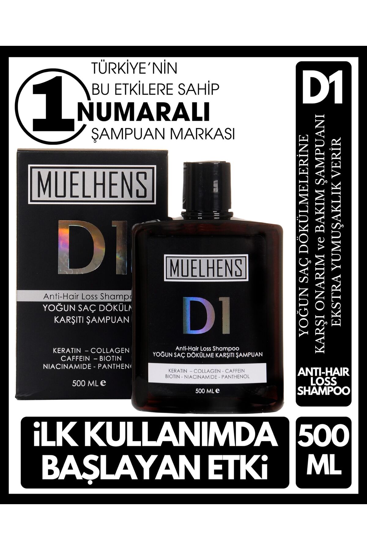 MUELHENS D1 ANTI HAIR LOSS SHAMPOO CARE SHAMPOO AGAINST INTENSE HAIR LOSS 500 ML PREVENTS HAIR LOSS AND HELP GENTLY CLEAN AND REPAIR YOUR HAIR AND SCALP. WHILE AIMING TO REDUCE IT WITH ARGININE, ZINC GLUCONATE AND BIOTIN, IT PROVIDES INTENSE CARE TO YOUR HAIR WITH HYDROLYZED SOY PROTEIN, KERATIN, COLLAGEN, HORSE CHESTNUT AND VITAMINS, MAKING YOUR HAIR A NATURAL, VIBRANT, SILKY AND LOUGH. IT HELP YOU GAIN THE APPEARANCE.