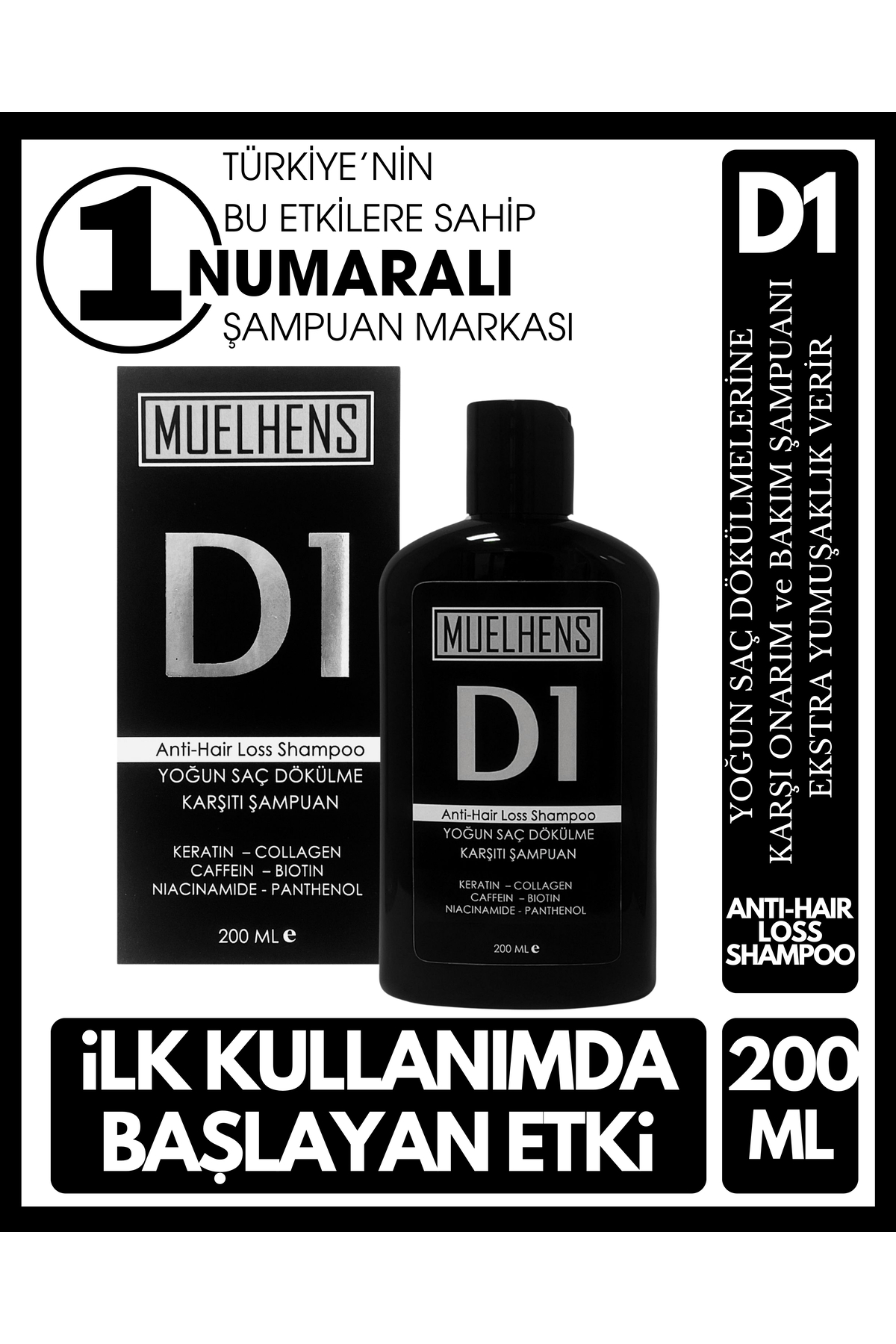 MUELHENS D1 ANTI HAIR LOSS SHAMPOO CARE SHAMPOO AGAINST INTENSE HAIR LOSS 200 ML PREVENTS HAIR LOSS AND HELP GENTLY CLEAN AND REPAIR YOUR HAIR AND SCALP. WHILE AIMING TO REDUCE IT WITH ARGININE, ZINC GLUCONATE AND BIOTIN, IT PROVIDES INTENSE CARE TO YOUR HAIR WITH HYDROLYZED SOY PROTEIN, KERATIN, COLLAGEN, HORSE CHESTNUT AND VITAMINS, MAKING YOUR HAIR A NATURAL, VIBRANT, SILKY AND LOUGH. IT HELP YOU GAIN THE APPEARANCE. IT HELPS TO GENTLY CLEAN AND REPAIR THE HAIR AND SCALP, ALONG WITH PREVENTING THE LOSS OF YOUR HAIR. WHILE AIMING TO REDUCE HAIR LOSS WITH ARGININE, ZINC GLUCONATE AND BIOTIN IN ITS CONTECT, HYDROLZED SOY PROTEIN, KERATIN, COLLAGEN, HORSE CHESTNUT AND VITAMINS HELP YOUR HAIR TO GAIN A NATURAL, LIVELYAND SILKY APPERARANCE BY PROVIDING INTENSIVE CARE.