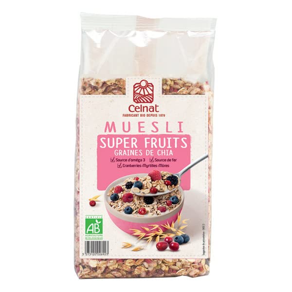 Organic Super Fruit Muesli with Chia Seeds - 375g. Celnat. Fruit Muesli. Organic Breakfast Cereals and Mixes. Sweet Groceries.Muesli Super Fruit Graines de Chia bio - 375g. Celnat. Muesli aux fruits. Céréales petit déjeuner et mélanges bio. Epicerie sucrée.MUESLI SUPER FRUIT GRAINES DE CHIA BIO - 375G, CELNAT, UNITÉ