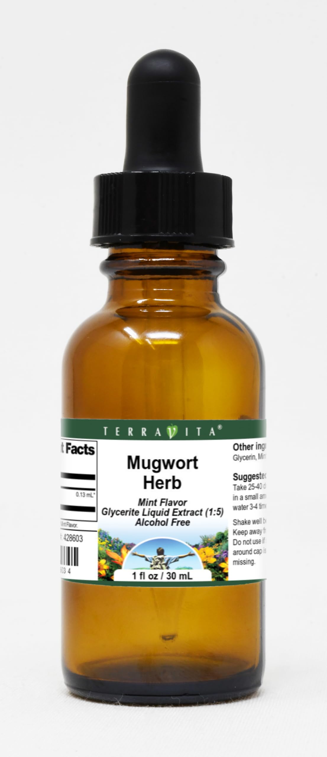 Convenient Liquid format. Size: 1 fl oz. Manufacturer: TerraVita. No fillers. Mugwort Herb - Glycerite Liquid Extract (1:5) - Mint Flavored (1 fl oz, ZIN: 428603).