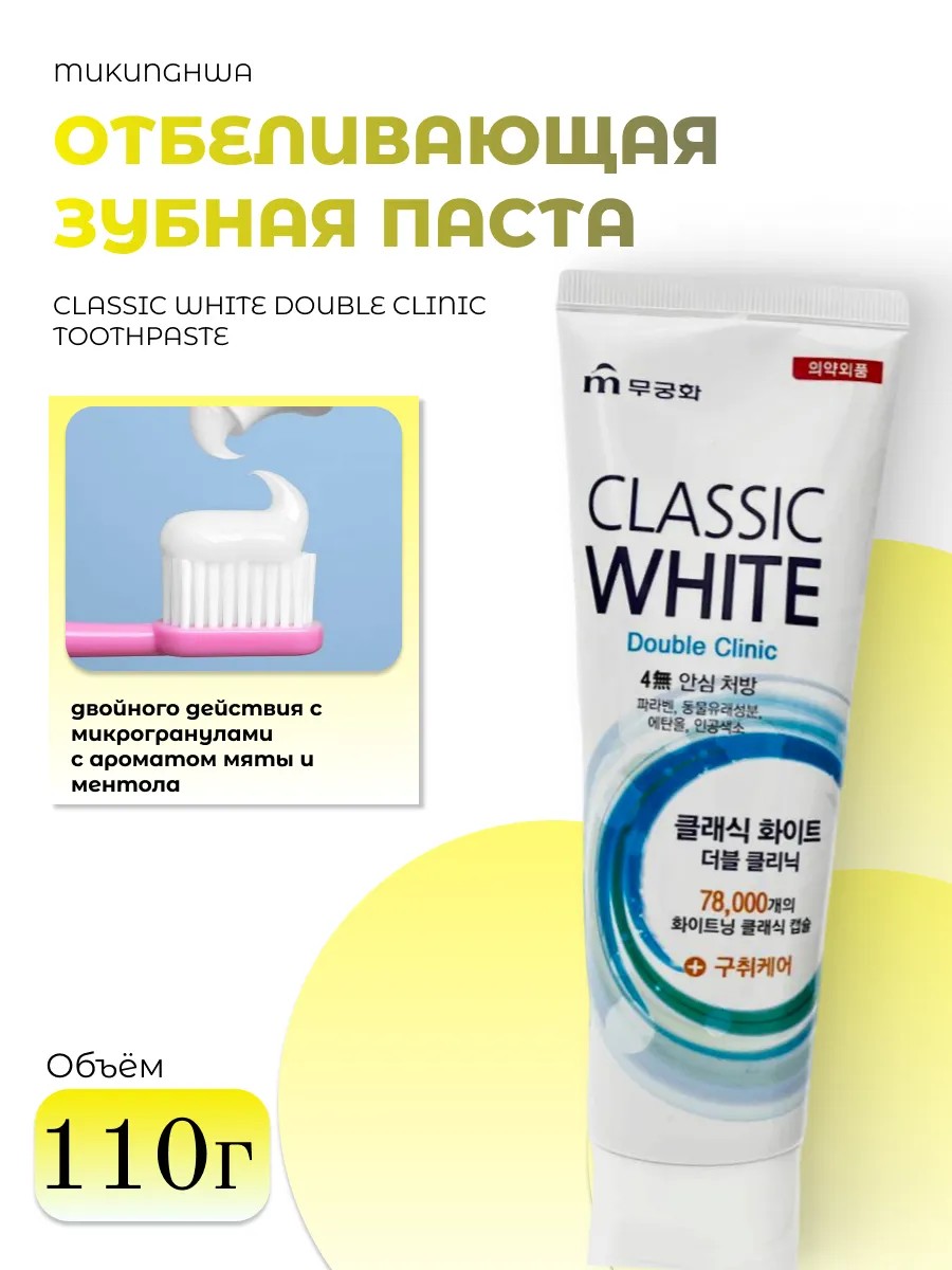 | Комплектация | Mukunghwa Отбеливающая зубная паста двойного действия с микрогранулами с ароматом мяты и ментола |