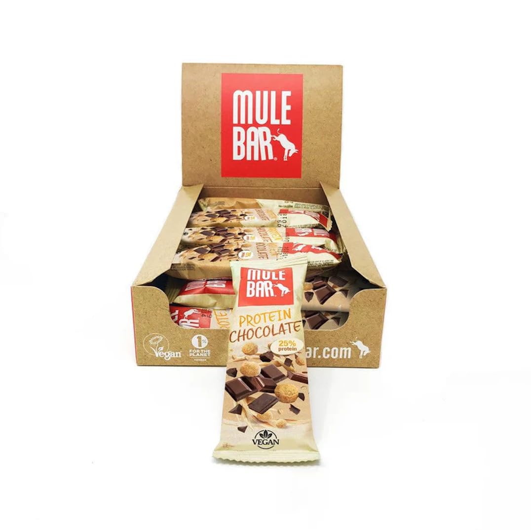 Mulebar Protein Bar Chocolate 42g (box of 15 bars) INGREDIENTS Oligofructose syrup, pea protein, raisins (sultanas, sunflower oil), oat flakes, soy extrudates 10 (soy protein isolate, tapioca starch, salt), sunflower oil, cocoa powder 4.0 , chocolate chips 3 (sugar, cocoa mass, cocoa butter, fat-reduced cocoa powder, emulsifier: sunflower lecithin, vanilla flavoring), rice flour, dark chocolate flavoring 0.6 . For allergens, see ingredients in bold. This bar made with natural ingredients may contain small pieces of shell or bark. Produced in a factory that uses other nuts, milk, and other cereals containing gluten.MULEBAR, HEALTHY PRODUCTS: Mulebar stands out for its natural ingredients, selected for their taste and nutritional qualities. The brand is acclaimed for its naturalness and digestibility, offering uncompromising energy. PERFECT FOR ENDURANCE ACTIVITIES: Mulebar protein bars are perfect for all your activities, whether in the great outdoors during hiking, trail running, cycling, or at the gym, and even to keep you going at the office. PRACTICAL PACKAGING: The Mulebar bar packaging is designed to be easily transportable and consumed easily after sports or when you feel peckish. In addition, its design ensures that the bar does not stick to the packaging. HEALTHY AND TASTY FORMULA: Known for its benefits for the heart, chocolate also promotes better concentration, strengthens memory, reduces stress and boosts morale on a daily basis. AN ESSENTIAL PROTEIN SUPPLY: Chocolate Mulebars are 100 natural, organic, and vegan, with 25 plant-based protein (10g soy protein). They promote better recovery after exercise and help build muscle mass. Barre Mulebar protéinée Chocolat 42g (boite de 15 barres) INGRÉDIENTS Sirop d'oligofructose, protéines de pois, raisins secs (raisins secs sultanines, huile de tournesol), flocons d'avoine, extrudés de soja 10 (isolat de protéines de soja, amidon de tapioca, sel), huile de tournesol, poudre de cacao 4,0 , pépites de chocolat 3 (sucre, pâte de cacao, beurre de cacao, cacao maigre en poudre, émulsifiant : lécithine de tournesol, arôme vanille), farine de riz, arôme chocolat noir 0.6 . Pour les allergènes, voir les ingrédients en gras. Cette barre fabriquée à base d'ingrédients naturels peut contenir des petits morceaux de coquilles ou d'écorces. Fabriqué dans une usine qui utilise d'autres noix, lait, et autres céréales contenant du gluten.MULEBAR, DES PRODUITS SAINS : Mulebar se distingue par ses ingrédients naturels, sélectionnés pour leur goût et leurs qualités nutritives. La marque est plébiscitée pour sa naturalité et sa digestibilité, offrant une énergie sans compromis. PARFAIT POUR LES ACTIVITÉS D'ENDURANCE : Les barres protéinées Mulebar sont parfaites pour toutes vos activités, que ce soit en pleine nature lors de randonnées, de trails, de cyclisme, ou en salle de sport, et même pour tenir le coup au bureau. EMBALLAGE PRATIQUE : Le packaging de la barre Mulebar est conçu pour être facilement transportable et consommé en toute simplicité après le sport ou en cas de petite faim. De plus, sa conception garantit que la barre ne colle pas à l'emballage. FORMULE SAINE ET SAVOUREUSE : Connu pour ses bienfaits pour le cœur, le chocolat favorise également une meilleure concentration, renforce la mémoire, réduit le stress et booste le moral au quotidien. UN APPORT PROTÉINÉ ESSENTIEL : Les Mulebar chocolat sont 100 naturelles, bio et vegan, avec 25 de protéines végétales (10g de protéine de soja). Elles favorisent une meilleure récupération après l'effort et aident à gagner en masse musculaire.