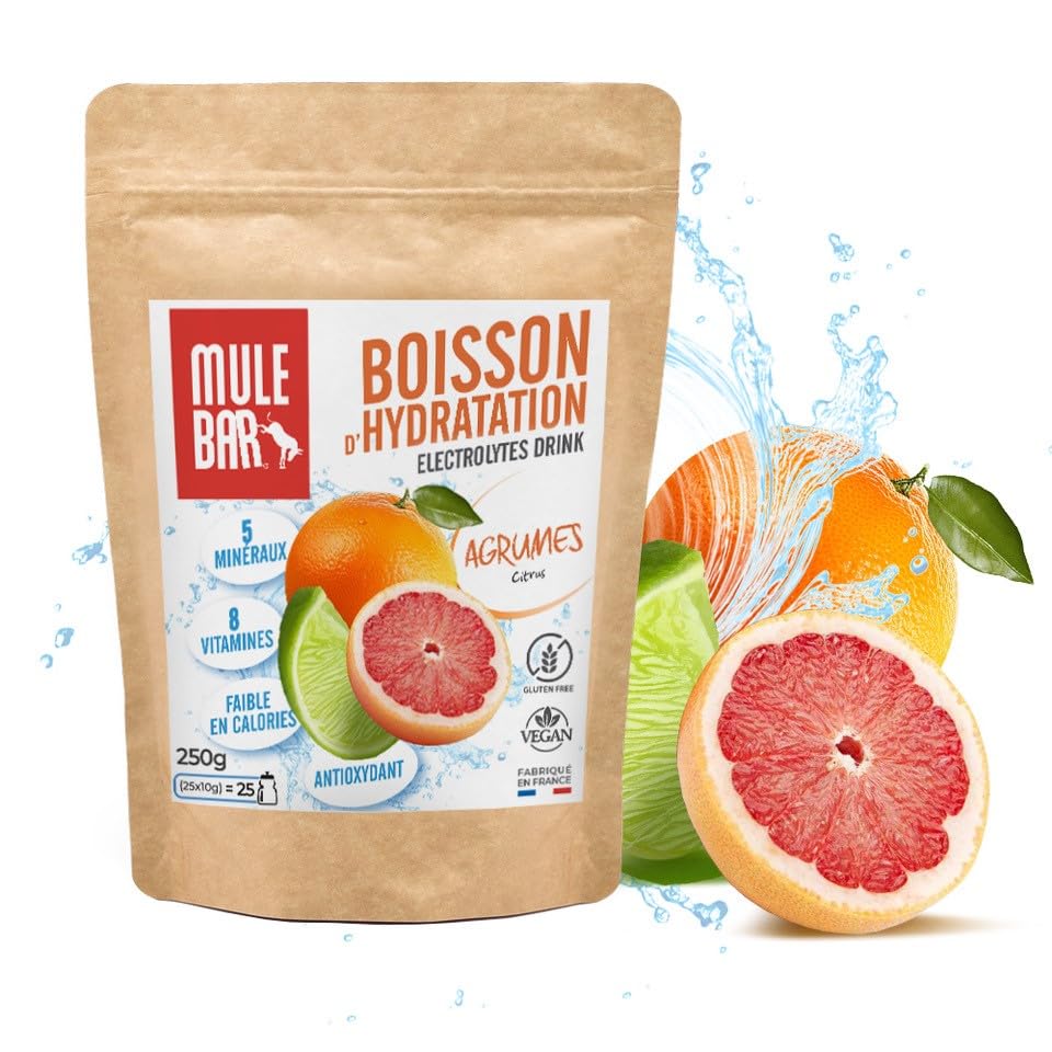 Born from the needs of two sports enthusiasts in search of pure nutrition, Mulebar offers 100 natural bars, gels, compotes and energy drinks. Without preservatives or additives, Mulebar guarantees optimal digestibility, allowing athletes to concentrate on their performance with healthy and delicious products. With Mulebar, enjoy the natural energy that supports you on your adventures, wherever you are. Boost your hydration with Mulebar hydration drink! Formulated to optimize hydration and enriched with mineral salts, trace elements and vitamins, it effectively compensates for water and electrolyte losses while supporting muscle recovery. With its practical 250 g sachet format, easily prepare 25 500 ml bottles, ideal for your training or everyday use. Suitable for everyone, it helps fight dehydration and is AFNOR NF EN 17444 anti-doping certified. INGREDIENTS Calcium gluconate, corn maltodextrin, potassium bicarbonate, sodium bicarbonate, magnesium citrate, natural flavors: lime, grapefruit and orange, citric acid, sweetener: sucralose, vitamins (C, B3, E, B1,B2, B6, B9, D), zinc bisglycinate, coloring ingredients: concentrated beet juice, concentrated acerola juice, lemon juice and powder turmeric.MULEBAR, HEALTHY PRODUCTS: Mulebar stands out for its natural ingredients, selected for their taste and nutritional qualities. The brand is acclaimed for its naturalness and digestibility, offering uncompromising energy. IDEAL FOR EVERYONE: Suitable for athletes as well as for everyday use, this drink helps fight dehydration, especially in hot weather or for those looking to reduce their soda consumption. AFNOR NF EN 17444 anti-doping certified. PRACTICAL SIZE: The 250g sachet makes 25 500ml bottles to take everywhere, ideal for staying hydrated and energized during your training or competitions. A HEALTHY AND TASTY FORMULA: Enriched with mineral salts, trace elements and vitamins, our citrus drink hydrates more quickly and supports muscle recovery thanks to its antioxidant properties. A DOSE OF HYDRATION: Our hydration drinks are formulated to optimize hydration while providing essential nutrients. Ideal before, during, and after exercise, they effectively replace water and electrolyte losses. Née des besoins de deux passionnés de sport en quête de nutrition pure, Mulebar propose des barres, gels, compotes et boissons énergétiques 100 naturels. Sans conservateurs ni additifs, Mulebar garantit une digestibilité optimale, permettant aux sportifs de se concentrer sur leurs performances avec des produits sains et délicieux. Avec Mulebar, savourez l'énergie naturelle qui vous soutient dans vos aventures, où que vous soyez. Boostez votre hydratation avec la boisson d'hydratation Mulebar ! Formulée pour optimiser l'hydratation et enrichie en sels minéraux, oligo-éléments et vitamines, elle compense efficacement les pertes en eau et électrolytes tout en soutenant la récupération musculaire. Avec son format pratique de sachet de 250 g, préparez facilement 25 gourdes de 500 ml, idéales pour vos entraînements ou au quotidien. Adaptée à tous, elle aide à lutter contre la déshydratation et est certifiée antidopage AFNOR NF EN 17444. INGRÉDIENTS Gluconate de calcium, maltodextrine de maïs, bicarbonate de potassium, bicarbonate de sodium, citrate de magnésium, arômes naturels : citron vert, pamplemousse et orange, acide citrique, édulcorant : sucralose, vitamines (C, B3, E, B1,B2, B6, B9, D), bisglycinate de zinc, ingrédients colorants : jus concentré de betterave, jus concentré d'acérola, jus de citron et poudre de curcuma.MULEBAR, DES PRODUITS SAINS : Mulebar se distingue par ses ingrédients naturels, sélectionnés pour leur goût et leurs qualités nutritives. La marque est plébiscitée pour sa naturalité et sa digestibilité, offrant une énergie sans compromis. IDÉAL POUR TOUS : Adaptée aux sportifs comme à un usage quotidien, cette boisson aide à lutter contre la déshydratation, surtout par temps chaud ou pour ceux qui cherchent à réduire leur consommation de sodas. Certifiée antidopage AFNOR NF EN 17444. FORMAT PRATIQUE : Le sachet de 250 g permet de préparer 25 gourdes de 500 ml à emporter partout, idéal pour rester hydraté et énergisé lors de vos entraînements ou compétitions. UNE FORMULE SAINE ET SAVOUREUSE : Enrichie en sels minéraux, oligo-éléments et vitamines, notre boisson aux agrumes hydrate plus rapidement et soutient la récupération musculaire grâce à ses propriétés antioxydantes. UNE DOSE D'HYDRATATION : Nos boissons d'hydratation sont formulées pour optimiser l'hydratation tout en apportant des nutriments essentiels. Idéales avant, pendant et après l'effort, elles compensent efficacement les pertes en eau et électrolytes.