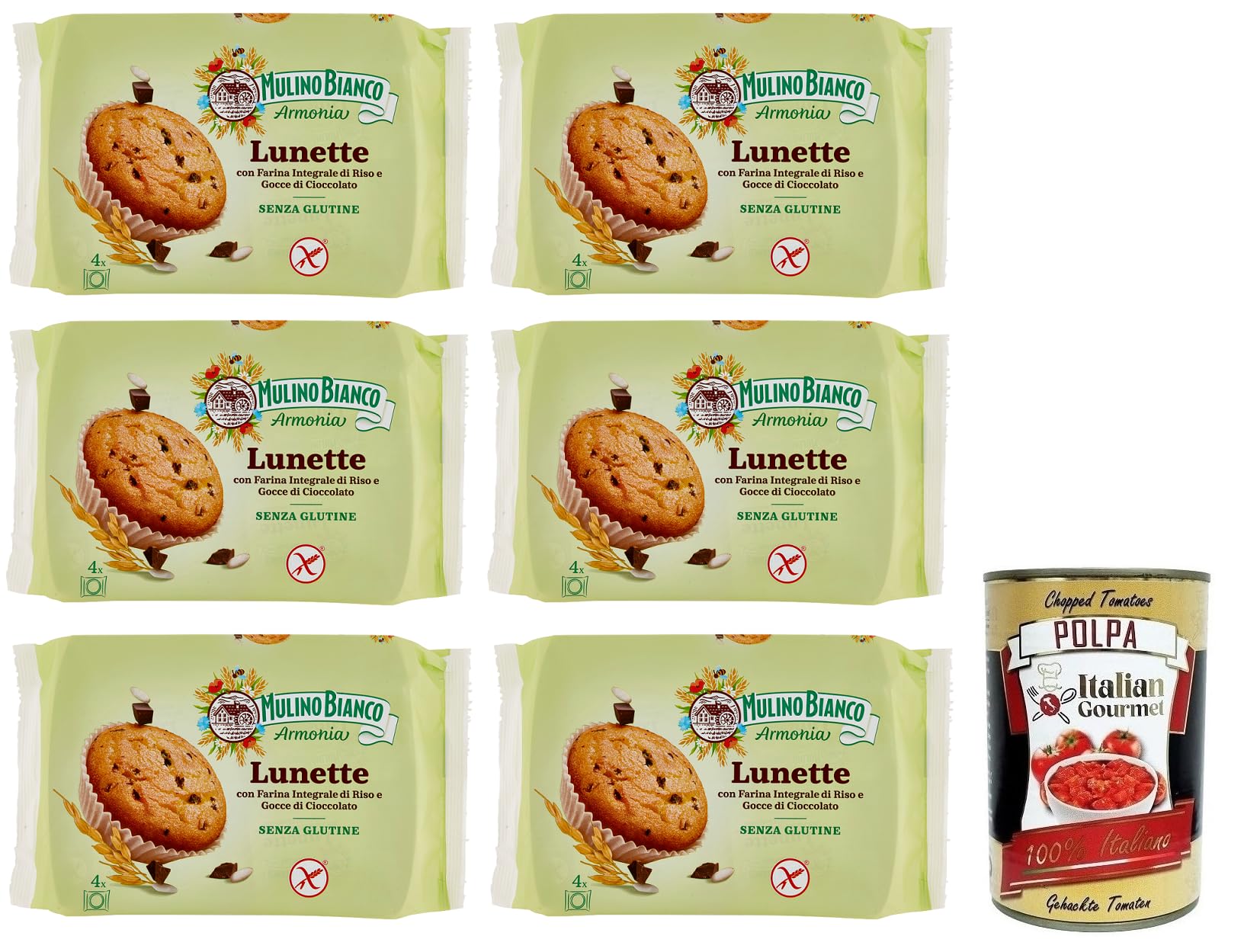 Mulino Bianco Lunette Tortina Senza Glutine Set of 6 Gluten Free Cakes with Whole Rice Flour and Chocolate Drops Pack of 140 g Each Pack Contains 4 Cakes + Polpa di Pomodoro