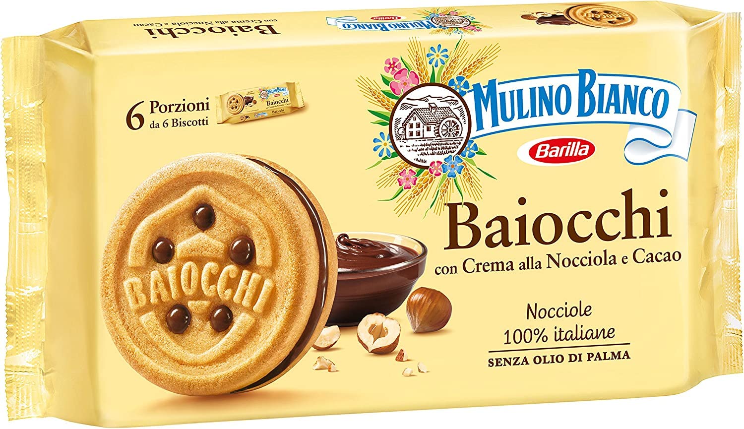 Mulino Bianco Baiocchi Biscuits with hazelnut and cocoa cream for breakfast and a sweet snack for meals – 6 servings with 6 biscuits. The Baiocchi feature a soft hazelnut and cocoa filling between two fragrant biscuits. Enjoy them from the biscuit pack or in convenient individual portions. Try 4 Baiocchi, a cappuccino, and an orange or other seasonal fruit of your choice. This provides 17 of your daily energy needs. Discover the entire Mulino Bianco biscuit range: simple and light, perfect for dipping, delicious with a delightful filling, full of fiber, gluten-free, and sugar-free. At Mulino Bianco, quality has always been our priority. Biscuits, sweets, snacks, bread, and treats to accompany you at any time of day. Biscuit ingredients: wheat flour, sugar, sunflower oil, fresh eggs, skimmed milk powder, fresh pasteurized milk (ammonium bicarbonate, sodium carbonate, sodium tartrate), salt, wheat starch, whipped cream flavoring, cocoa nibs and cocoa 26.5 : vegetable sugar, vegetable fats and oils (shea, coconut, cocoa), crepe nuts 6.4 of the finished product, cocoa 2.7 of the finished product, milk powder, wheat starch, flavoring - May contain traces of other fruits, seeds, sesame, and soy. INGREDIENTS Biscuit Ingredients: Wheat flour, sugar, sunflower oil, fresh eggs, skimmed milk powder, pasteurized fresh milk, leavening (ammonium bicarbonate, sodium bicarbonate, monocalcium tartrate), salt, wheat starch, coal cream and cocoa flavoring 26.5 : sugar, vegetable fats and oils (shea, coconut, cocoa), chicken nuts 6.4 of the finished product, cocoa 2.7 of the finished product, skimmed milk powder, wheat starch, flavoring. May contain traces of other nuts, sesame, and soy.Mulino Bianco Baiocchi Chocolat Râteau Biscuits Gâteau avec Chocolat 336gr Multi Package SnackDESCRIPTION DU PRODUIT DESCRIPTION DU PRODUIT Mulino Bianco Biscuits Baiocchi avec crème de noisettes et de cacao pour le petit-déjeuner et un en-cas sucré pour les repas – 6 portions avec 6 biscuits. Les Baiocchi contiennent un rembourrage doux de noisetier et de cacao entre deux biscuits parfumés. Vous pouvez les déguster aussi bien dans le paquet de biscuits que dans des portions individuelles pratiques. 4 Baiocchi, un cappuccino et un orange ou fruit de votre choix de la saison. Pour une quantité totale de calories correspondant à 17 de vos besoins d'énergie quotidiens. Découvrez toute la gamme des biscuits Mulino Bianco : simple et léger, bon pour tremper, délicieux avec un délicieux garnissage, pleine et fibres, sans gluten ni sucre. Chez Mulino Bianco, la qualité a toujours été accordée. Biscuits, bonbons, collations, pain et collations qui vous accompagneront à tout moment de la journée. Ingrédients biscuits : farine de blé, sucre, huile de tournesol, œufs frais, poudre de lait maigre, lait pasteurisé frais (bicarbonate d'ammonium, carbonate de sodium, tartrate de sodium), sel, amidon de blé, arôme de chantilly, noix de cacao et cacao 26,5 : sucre végétal. graisses et huiles végétales (karité, coco, cacao), noix de crêpe 6,4 sur le produit fini, cacao 2,7 sur le produit fini, poudre de lait madrier, amidon de blé, arôme - Peut contenir des traces d'autres fruits de graines, de ssame et de soja. INGRÉDIENTS Ingrédients Biscuits : farine de blé, sucre, huile de tournesol, œufs frais, lait écrémé en poudre, lait frais pasteurisé, levure (hydrogénocarbonate d'ammonium, hydrogénocarbonate de sodium, tartrate de monocalium), sel, amidon de blé, arôme de crème de houille et cacao 26,5 : sucre , graisses végétales et huiles (karité, noix de coco, cacao), noix de poulet 6,4 sur le produit fini, cacao 2,7 sur le produit fini, LAIT écrémé en poudre, amidon de blé, arôme Peut contenir des traces d'autres fruits à coque, sésame et soja