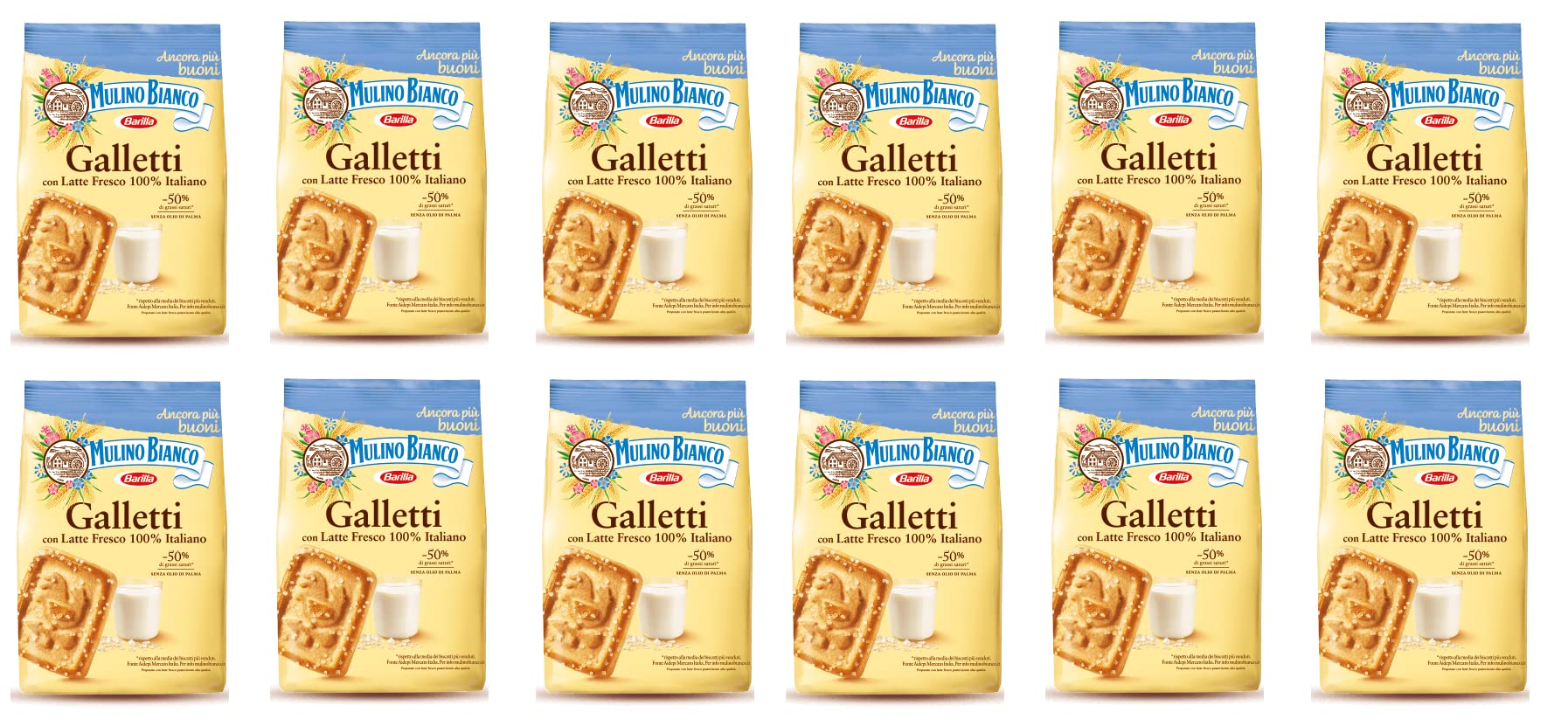 These galetti have such a simple taste because, thanks to their new formula, they combine the lightness of a thin shortcrust pastry with fresh Italian milk. With their delicate flavor, they melt gently in your mouth. Ingredients: wheat flour, sunflower oil, sugar, high-quality pasteurized fresh milk 3 , granulated sugar 3 , leavening (ammonium bicarbonate, sodium carbonate), salt, wheat starch, honey, milk proteins, vanillin flavoring. May contain traces of nuts, sesame, soy, and eggs. The highlighted ingredients may cause reactions in people with allergies or intolerances. Free from: palm oil, coloring additives, preservatives, hardened fats, and GMO ingredients. Per 100g: Energy 1992 kJ – 475 kcal, Fat 18.7 g (of which saturates 2.2 g), Carbohydrate 68.0 g (of which sugars 18.5 g), Fiber 2.9 g, Protein 7.1 g, Salt 0.950 g. INGREDIENTS: Izen flour, sunflower oil, sugar, high-quality pasteurized fresh milk 3 , granulated sugar 3 , leavening (ammonium bicarbonate, sodium carbonate), salt, wheat starch, honey, milk proteins, vanillin flavoring. May contain traces of nuts, sesame, soy, and eggs.Lot de 12 biscuits Barilla Mulino Bianco Galletti - Avec lait italien frais - 800 gDESCRIPTION DU PRODUIT DESCRIPTION DU PRODUIT Les galetti ont un goût si simple car grâce à leur nouvelle formule, ils combinent la légèreté d'une pâte brisée fine avec du lait frais italien. Avec leur goût délicat, ils se fondent doucement dans la bouche. Ingrédients : farine de blé, huile de tournesol, sucre, lait frais pasteurisé de haute qualité 3 , sucre cristal 3 , levure (bicarbonate d'ammonium, carbonate de sodium), sel, amidon de blé, miel, protéines de lait, arôme vanilline. Il peut contenir des traces de noix, de sésame, de soja et d'œufs. Les ingrédients mis en valeur peuvent provoquer des réactions chez les personnes allergiques ou intolérantes. Sans : huile de palme, additifs colorants, additifs de conservation, graisses durcies, ingrédients OGM pour 100 g : énergie 1992 kJ – 475 kcal graisses 18,7 g dont acides gras saturés 2,2 g - HYDRATE de carbone 68,0 g dont sucre 18,5 g. Fibres 2 ,9 g de protéine 7,1 g de sel 0,950 g. INGRÉDIENTS farine de izen, huile de tournesol, sucre, lait frais pasteurisé de haute qualité 3 , sucre cristal 3 , levure (bicarbonate d'ammonium, carbonate de sodium), sel, amidon de blé, miel, protéines de lait, arôme vanilline. Il peut contenir des traces de noix, de sésame, de soja et d'œufs.
