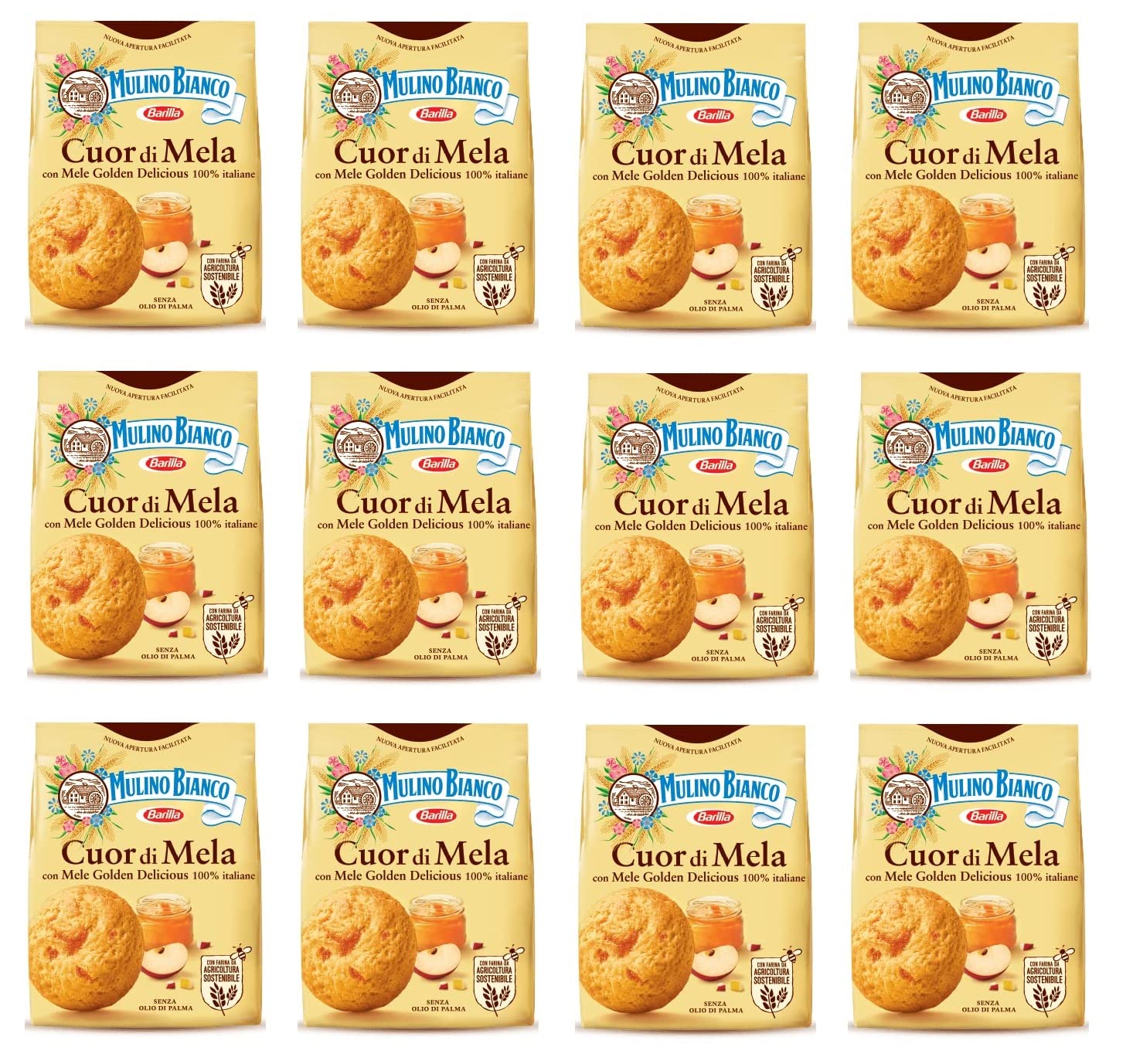 Cuor di Mela are flavored shortcrust pastry boxes filled with 100 Italian apple marmalade, decorated with diced apples exclusively harvested in Emilia-Romagna. Ingredients: wheat flour, apple marmalade 23.7 (apple puree 18.4 , glucose syrup, dextrose, apple juice 3 , sugar, gelling agent: pectin, acidity regulator: citric acid), sugar, sunflower oil, glucose syrup, apple 3.3 , fresh butter. Milk powder, glucose-fructose syrup, modified starch, wheat fiber, leavening agent (ammonium bicarbonate, sodium bicarbonate, monocalcium tartrate), apple cider vinegar, salt, flavorings, cinnamon. May contain traces of peanuts, tree nuts, sesame, and soy. The highlighted ingredients may cause reactions in people with allergies or intolerances. Free from: palm oil, coloring additives, preservatives, hardened fats, GMO ingredients. Per 100g: Energy 1793 kJ – 427 kcal, Fat 15.0 g of which saturates 3.3 g, Carbohydrate 66.5 g of which sugars 31.0 g, Fiber 2.8 g, Protein 5 g, Salt 0.275 g. INGREDIENTS Wheat flour, apple marmalade 23.7 (apple puree 18.4 , glucose syrup, dextrose, apple juice 3 , sugar, gelling agent: pectin, acidity regulator: citric acid), sugar, sunflower oil, glucose syrup, apple 3.3 , butter, fresh eggs, skimmed milk. Fructose, glucose syrup, modified starch, wheat fiber, yeast (ammonium bicarbonate, sodium bicarbonate, monocalcium tartrate), apple cider vinegar, salt, flavorings, cinnamon. May contain traces of peanuts, tree nuts, sesame, and soy.Lot de 12 biscuits au beurre Mulino Bianco Cuor di Mela avec marmelade de de pomme 300 gDESCRIPTION DU PRODUIT DESCRIPTION DU PRODUIT Les Cuor di Mela sont des boîtes en pâte brisée parfumée remplie de marmelade de pomme 100 italienne, décorées de pommes cubées exclusivement récoltées dans l'Emilia Romagna. Ingrédients : farine de blé, marmelade de pomme 23,7 (purée de pomme 18,4 , sirop de glucose, dextrose, jus de pomme 3 , sucre, gélifiant : pectine, régulateur d'acidité : acide citrique), sucre, huile de tournesol, sirop de glucose, pomme 3,3 , beurre frais. Lait écécécécécécpoudre, sirop de glucose fructose, amidon modifié, fibres de blé, levure (bicarbonate d'ammonium, bicarbonate de sodium, tartrate de monocalium), vinaigre de pomme, sel, arômes, cannelle. Il peut contenir des traces de cacahuètes, de fruits à coque, de sésame et de soja. Les ingrédients mis en valeur peuvent provoquer des réactions chez les personnes allergiques ou intolérantes. Sans : huile de palme, additifs colorants, additifs de conservation, graisses durcies, ingrédients OGM pour 100 g : énergie 1793 kJ – 427 kcal graisse 15,0 g dont acides gras saturés 3,3 g, hydrate de carbone 66,5 g dont sucre 31,0 g. Fibres 2 ,8 g de protéine 5 g de sel 0,275 g. INGRÉDIENTS Farine de blé, marmelade de pomme 23,7 (purée de pomme 18,4 , sirop de glucose, dextrose, jus de pomme 3 , sucre, gélifiant : pectine, régulateur d'acidité : acide citrique), sucre, huile de tournesol, sirop de glucose, pomme 3,3 , beurre, œufs frais, lait écrémé. Fructose Sirop de glucose, amidon modifié, fibres de blé, levure (bicarbonate d'ammonium, bicarbonate de sodium, tartrate de monocalium), vinaigre de pomme, sel, arômes, cannelle. Il peut contenir des traces de cacahuètes, de fruits à coque, de sésame et de soja.