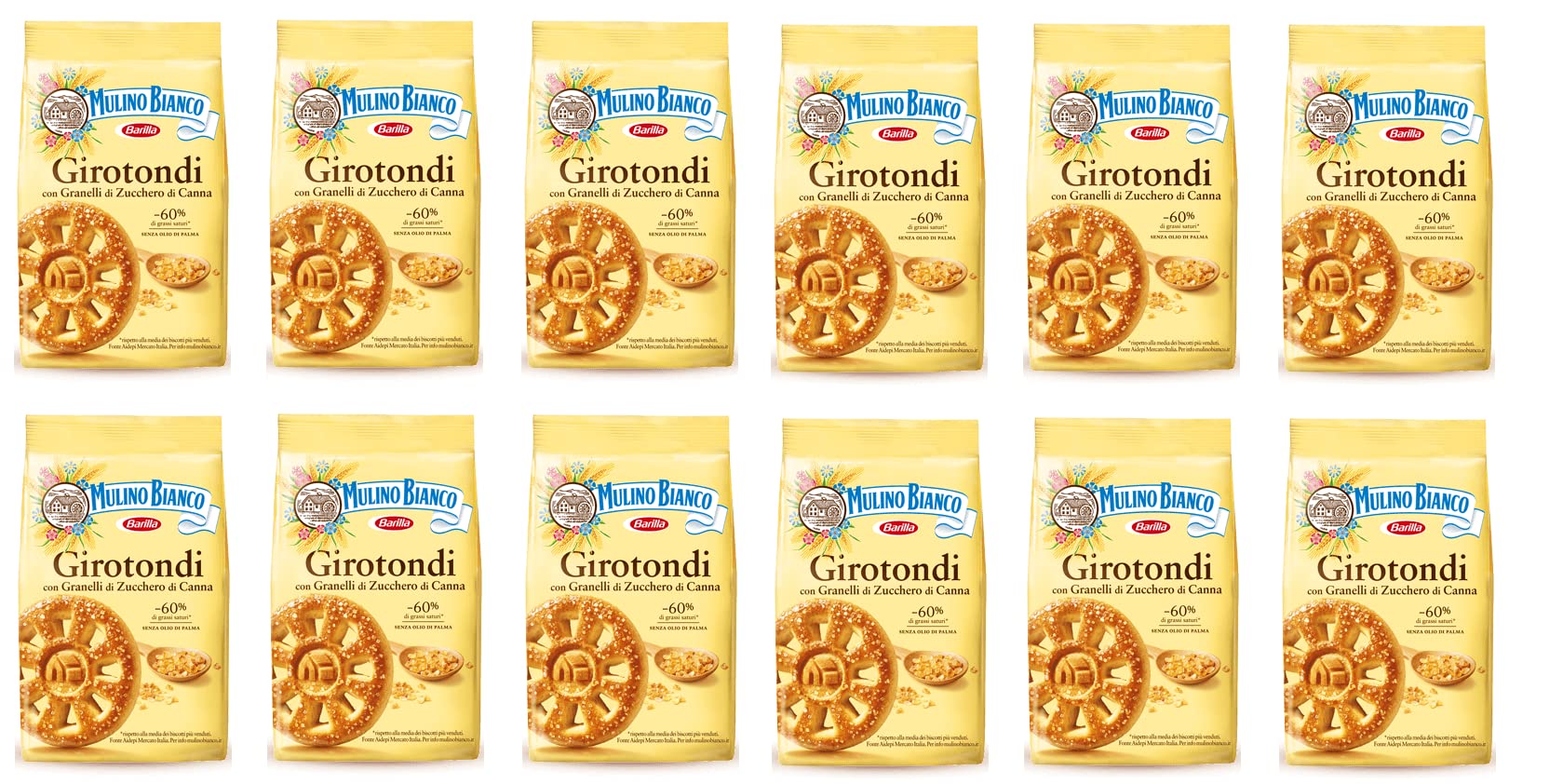 Girotondi with Granelli di Zucchero di Canna – 60 saturated fat Free from palm oil and brown sugar – Girotondi's light, crispy texture and delicate flavor, sweetened by the large amber cane sugar crystals on the surface, offer a simple and refined experience. Ideal to enjoy on its own or with your favorite beverage. Wheat Flour - Ingredients: wheat flour 59.5 , sugar, sunflower oil, wheat starch, 3.7 cane sugar, skimmed milk, propellant (ammonium carbonate, sodium carbonate), milk proteins, salt, vanillin flavoring. May contain traces of nuts, soy, and eggs. Highlighted ingredients may cause reactions in people with allergies or intolerances. Free from: palm oil, coloring additives, preservatives, hydrated fats, and GMO ingredients. INGREDIENTS Wheat flour 59.5 , sugar, sunflower oil, wheat starch, 3.7 cane sugar, skimmed milk, propellant (ammonium carbonate, sodium carbonate), milk proteins, salt, vanillin flavoring. May contain traces of nuts, soy, and eggs.Lot de 12 biscuits Mulino Bianco Girotondi avec grains de sucre 350 gDESCRIPTION DU PRODUIT DESCRIPTION DU PRODUIT Girotondi avec Granelli di Zucchero di Canna – 60 de graisse saturée Sans huile de palme et sucre marron – La structure légère et croustillante de Girotondi et son goût délicat qui est sucré à la surface du sucre de canne ambré en gros cristaux apportent une expérience simple et délicate. Idéal pour manger seul ou accompagner votre boisson préférée. Farine de blé - Ingrédients : farine de blé 59,5 , sucre, huile de tournesol, amidon de blé, 3,7 sucre de canne, lait écrémé, propulseur (carbonate d'ammonium, carbonate de sodium), protéines de lait, sel, goût vanilline. Peut contenir des traces de noix, de soja et d'œufs. Les ingrédients mis en valeur peuvent provoquer des réactions chez les personnes allergiques ou intolérantes. Sans : huile de palme, additifs colorants, conservateurs, graisses hydratées, ingrédients OGM. INGRÉDIENTS Farine de blé 59,5 , sucre, huile de tournesol, amidon de blé, 3,7 sucre de canne, lait écrémé, agent propulseur (carbonate d'ammonium, carbonate de sodium), protéines de lait, sel, goût vanilline. Peut contenir des traces de noix, de soja et d'œufs