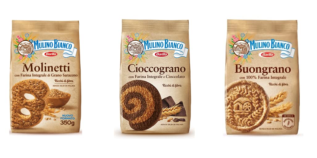 Ingredients: Wholemeal flour 68.8 , sunflower oil, sugar, cane sugar 7.3 , honey 1.9 , fresh pasteurized milk, barley malt extract, yeast (sodium bicarbonate), flavorings (milk), salt. May contain traces of: nuts and soy. The highlighted ingredients may cause reactions in people with allergies or intolerances. Free from: palm oil, coloring additives, preservatives, hardened fats, GMO ingredients. Per 100g: Energy 1897 kJ – 452 kcal, Fat 16.3 g of which saturates 1.6 g, Carbohydrate 64.3 g of which sugars 20.5 g. Fiber 8 g, Protein 7.7 g, Salt 0.543 g. INGREDIENTS Wholemeal flour 68.8 , sunflower oil, sugar, cane sugar 7.3 , honey 1.9 , fresh pasteurized milk, fresh egg, barley malt extract, raising agents (sodium bicarbonate, ammonium hydrogen carbonate), flavorings (milk), salt. May contain traces of: nuts and soy. Ingredients: Wholemeal flour 68.8 , sunflower oil, sugar, cane sugar 7.3 , honey 1.9 , fresh pasteurized milk, barley malt extract, yeast (sodium bicarbonate), flavorings (milk), salt. May contain traces of: nuts and soy. The highlighted ingredients may cause reactions in people with allergies or intolerances. Free from: palm oil, coloring additives, preservatives, hardened fats, GMO ingredients. Per 100g: Energy 1897 kJ – 452 kcal, Fat 16.3 g of which saturates 1.6 g, Carbohydrate 64.3 g of which sugars 20.5 g. Fiber 8 g, Protein 7.7 g, Salt 0.543 g. INGREDIENTS Wholemeal flour 68.8 , sunflower oil, sugar, cane sugar 7.3 , honey 1.9 , fresh pasteurized milk, fresh egg, barley malt extract, raising agents (sodium bicarbonate, ammonium hydrogen carbonate), flavorings (milk), salt. May contain traces of: nuts and soy.Lot de 3 biscuits Mulino Bianco 100 grains pleins 3 x 350 gDESCRIPTION DU PRODUIT DESCRIPTION DU PRODUIT Ingrédients : farine complète 68,8 , huile de tournesol, sucre, sucre de canne 7,3 , miel 1,9 , lait pasteurisé frais, extrait de malt d'orge, levure (bicarbonate de sodium), arômes (lait), sel. Il peut contenir des traces de : fruits à coque et soja. Les ingrédients mis en valeur peuvent provoquer des réactions chez les personnes allergiques ou intolérantes. Sans : huile de palme, additifs colorants, additifs de conservation, graisses durcies, ingrédients OGM pour 100 g : énergie 1897 kJ – 452 kcal, graisse 16,3 g dont acides gras saturés 1,6 g , hydrate de carbone 64,3 g dont sucre 20,5 g. 8 fibres ,7 g de protéine 7,7 g de sel 0,543 g. INGRÉDIENTS farine complète 68,8 , huile de tournesol, sucre, sucre de canne 7,3 , miel 1,9 , lait pasteurisé frais, œuf frais, extrait de malt d'orge, agent de levure (bicarbonate de sodium, carbonate d'hydrogénate d'ammonium), arômes (lait), sel. Il peut contenir des traces de : fruits à coque et soja.