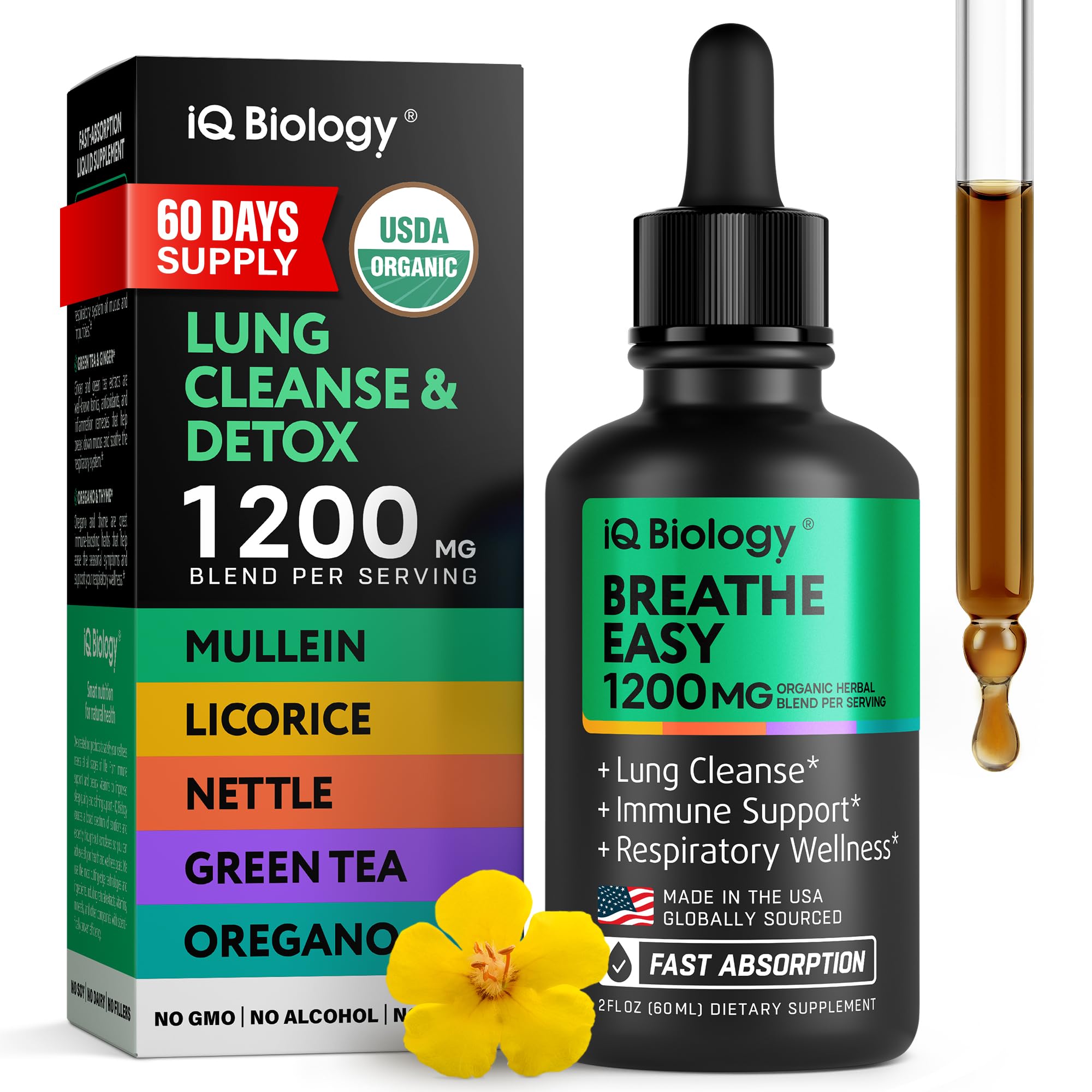 USDA Organic Mullein Nettle Supplement — IQ Biology produces liquid mullein drops for lungs with tested and approved ingredients. Our drops are USDA certified organic, vegan, cruelty-free. Made from mullein leaves grown using organic farming methods, this clean formula supports respiratory health. Unlike many wild mullein drops for lungs, our product is certified and third-party tested for for purity and quality. High Absortion Mullein Leaf Extract for Lungs – The powerful IQ Biology respiratory lung health drops are made in USA. The respiratory lung health supplement is made following all the strict manufactured laws and regulations to produce a successful mullein leaf extract product for your lung health. Faster absorption than mullein oil or mullein tea bags with organic glycerin base – unlike mullein tincture – to support healthy, clear lungs. Lung Health Supplement for Immune Support – Feel the impact of the high-concentration mix of lung cleaner components. Mullein extract with licorice and green tea support lung function and promote clearer airways. The nettle drops blend of oregano leaf, and thyme ensures powerful immune system support and clears mucus. Designed for natural lung cleansing processes, the presence of ginger root adds an antioxidant effect to the lung support supplement. Respiratory Support Mucus Relief – Unlock the brand-new lung detox supplement and mucus clearance by IQ Biology and get breathing comfort! The combination of herbal ingredients such as mullein leaf, licorice, green tea, stinging nettle leaf, ginger root, oregano, and thyme is the natural respiratory support for your well-being and mucus removal from lungs. Start the lung health care process with this natural lung detox solution, ideal for those looking to detox lungs for smokers. Lung Detox with Mullein Leaf Extract – Experience the power of pure mullein drops for lungs at full effectiveness. The herbal supplements are enriched with USDA certified organic mullein extract (Verbascum thapsus) and 6 herbs help to clear mucus and provide an effective lung cleanse and lung detox for smokers and non-smokers. Mullein herbs for lungs support respiratory system health and help thin mucus in the chest or throat. Discover a natural drink to get rid of mucus with IQ Biology drops.
