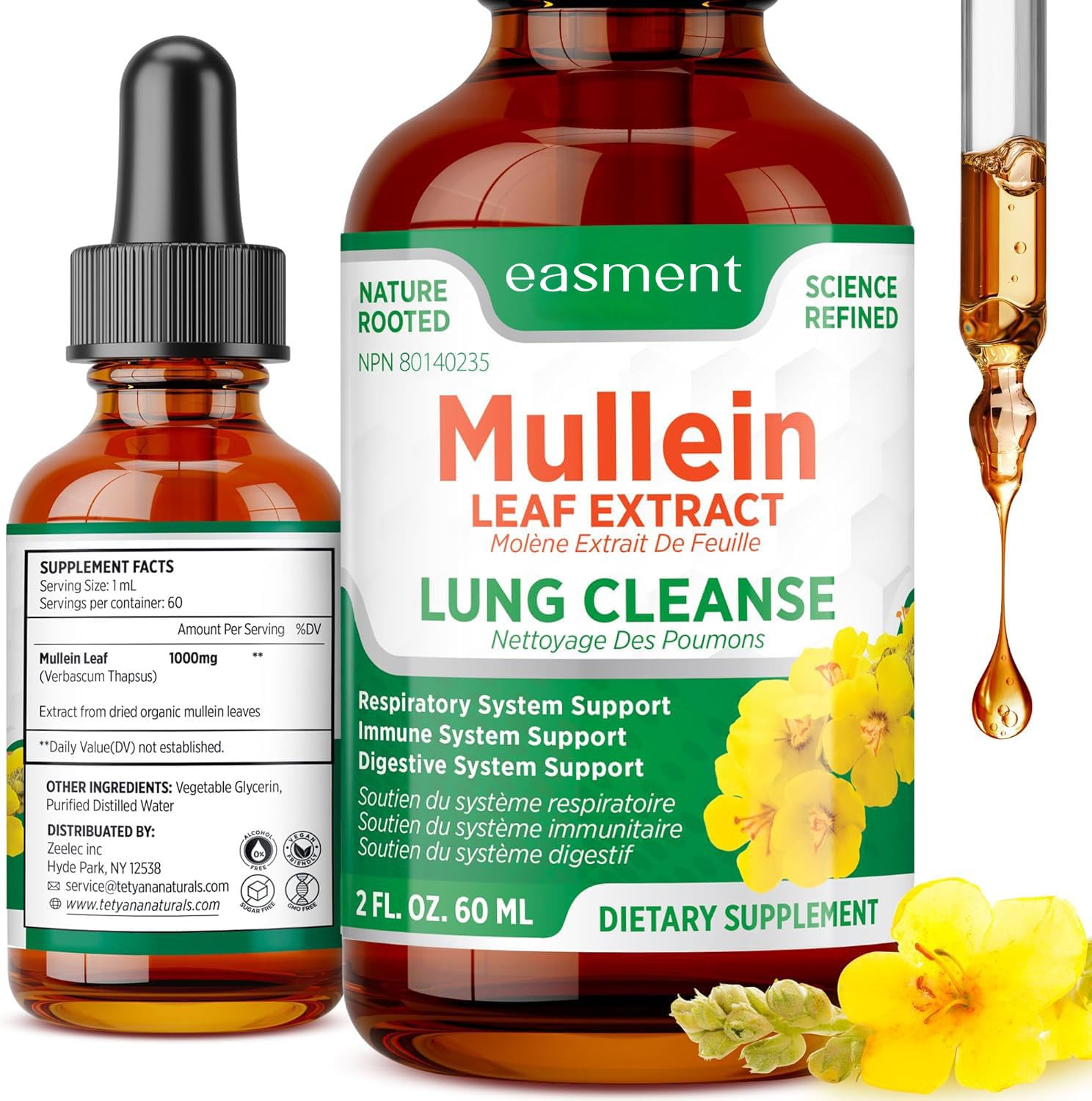 Safe Use Reminder: If you are taking blood thinners or other medications, or have a medical condition, consult your doctor before use. Pure Alcohol-Free Formula – Made with only mullein leaf extract, purified water, and vegetable glycerin. No alcohol, no artificial additives – a clean, safe, and gentle choice. Supports Lung Cleanse Detox – Designed to help cleanse the lungs and support healthy airways, especially beneficial during cold season or for those looking for natural lung detox. Powerful Herbal Drops – Our mullein drops are a natural option to support clear breathing and overall respiratory comfort, helping you breathe free with confidence every day. Mullein Leaf Extract for Lungs – Mullein (Verbascum thapsus) is traditionally used in Herbal Medicine as an expectorant and demulcent to help relieve cough, soothe the respiratory tract, and ease excess mucus and phlegm. Health Canada licensed, NPN 80140235.