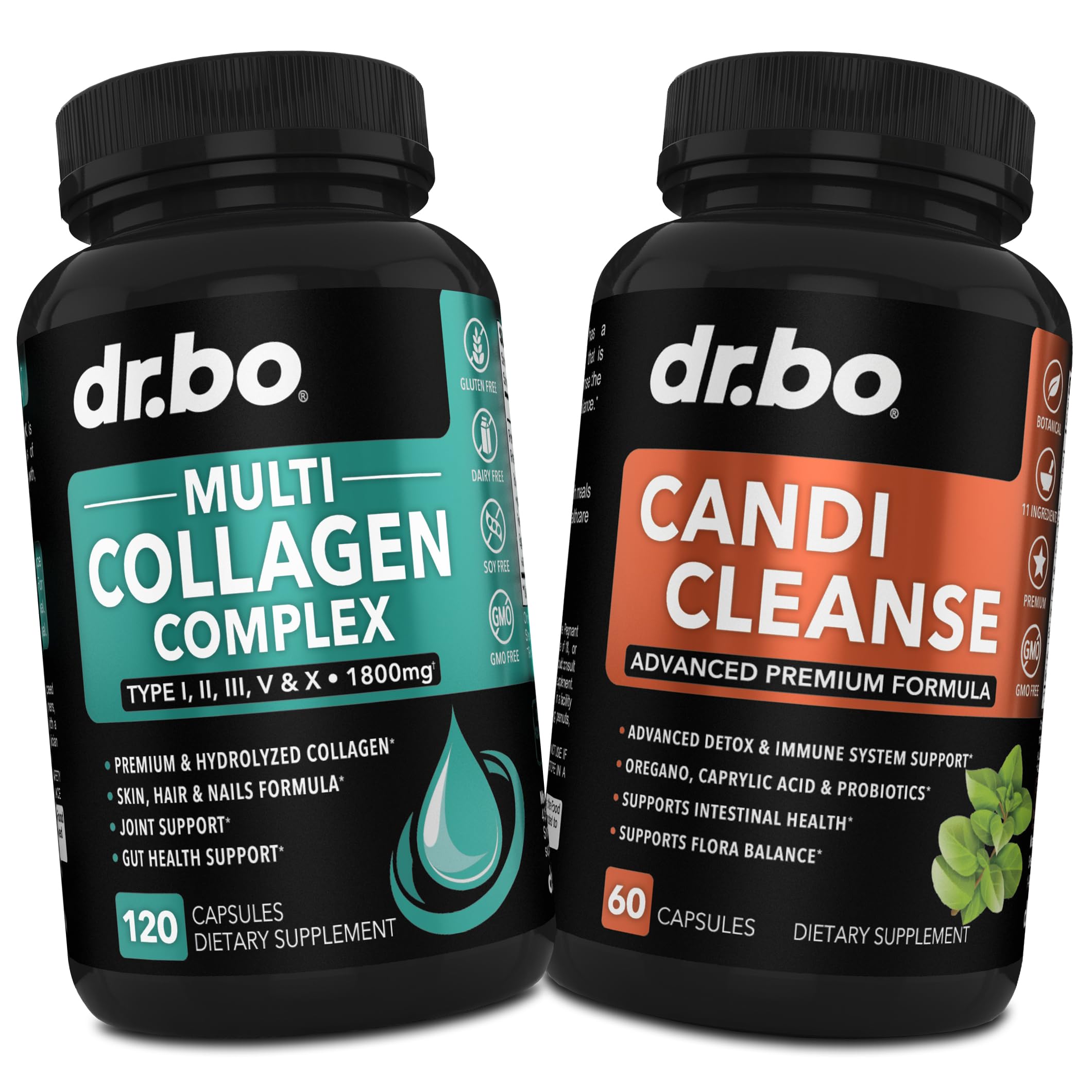 Multi Collagen Peptides & Candida Cleanse - Type I II III V & X Multi Collagen Skin Hair & Nails - Extra Strength Probiotic Complex Cleanser Natural Oral Herbal Oregano & Caprylic Acid Capsules