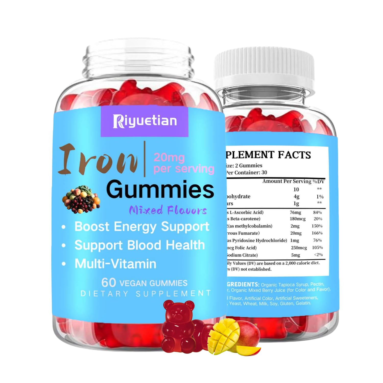Statements regarding dietary supplements have not been evaluated by the FDA and are not intended to diagnose, treat, cure, or prevent any disease or health condition.PURE SAFE: Made with non-GMO, vegan-friendly ingredients in GMP-certified facilities under strict quality control. Our Gummies absorb faster than traditional pills, capsules, and powders. If you're not satisfied, simply contact us for support. NATURAL STOMACH-FRIENDLY: Enjoy delicious mixed flavors with a great taste and no aftertaste. These chewable supplements promote the formation of red blood cells without stomach discomfort. Free of artificial colors, gluten, dairy and soy, our iron gummies are gentle on the stomach and perfect for daily consumption. PREMIUM FORMULA FULL NUTRITIONAL SUPPORT: Our premium iron and multivitamin blend includes 20 mg of iron, 180 mcg of Vitamin A, 76 mg of Vitamin C, 250 mcg DFE Folate, 2 mg of Vitamin B12, 1 mg of Vitamin B6, and 5 mg of Sodium. This iron supplements formula helps reduce fatigue, boost energy, enhance concentration, strengthen immunity and supports overall well-being, without causing nausea or constipation. MAXIMIZE ABSORPTION SUSTAINED ENERGY: Our iron supplement for women and men is designed to enhance iron absorption—ideal for individuals with Ferrous Fumarate deficiency, fatigue, and weakness, ensuring your body gets the most out of each serving. FIGHT COLD EXTREMITIES BOOST VITALITY: Riyuetian iron supplement gummies combine essential minerals and vitamins to provide a fun and easy way to support your iron levels. These iron gummies are designed for women and men with cold hands and feet. Each serving provides 20mg of high-quality iron plus Vitamins B6, B12, C, and Folate to enhance mineral absorption and overall vitality.