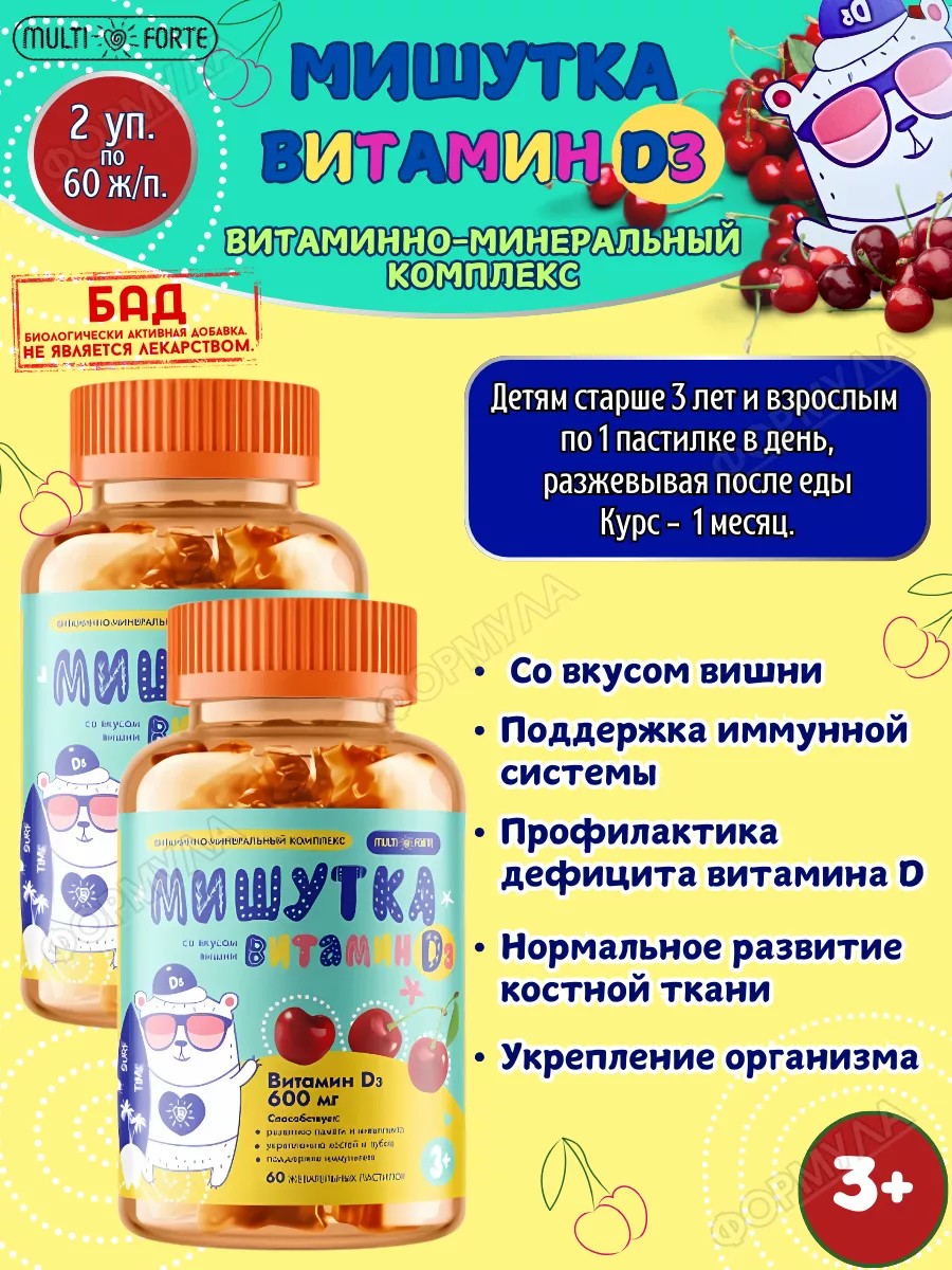 | Комплектация | Мишутка Мармеладки Витамин D3 MultiForte пастилки жев (со вкусом вишни) 600 мг х60; 2 уп |
