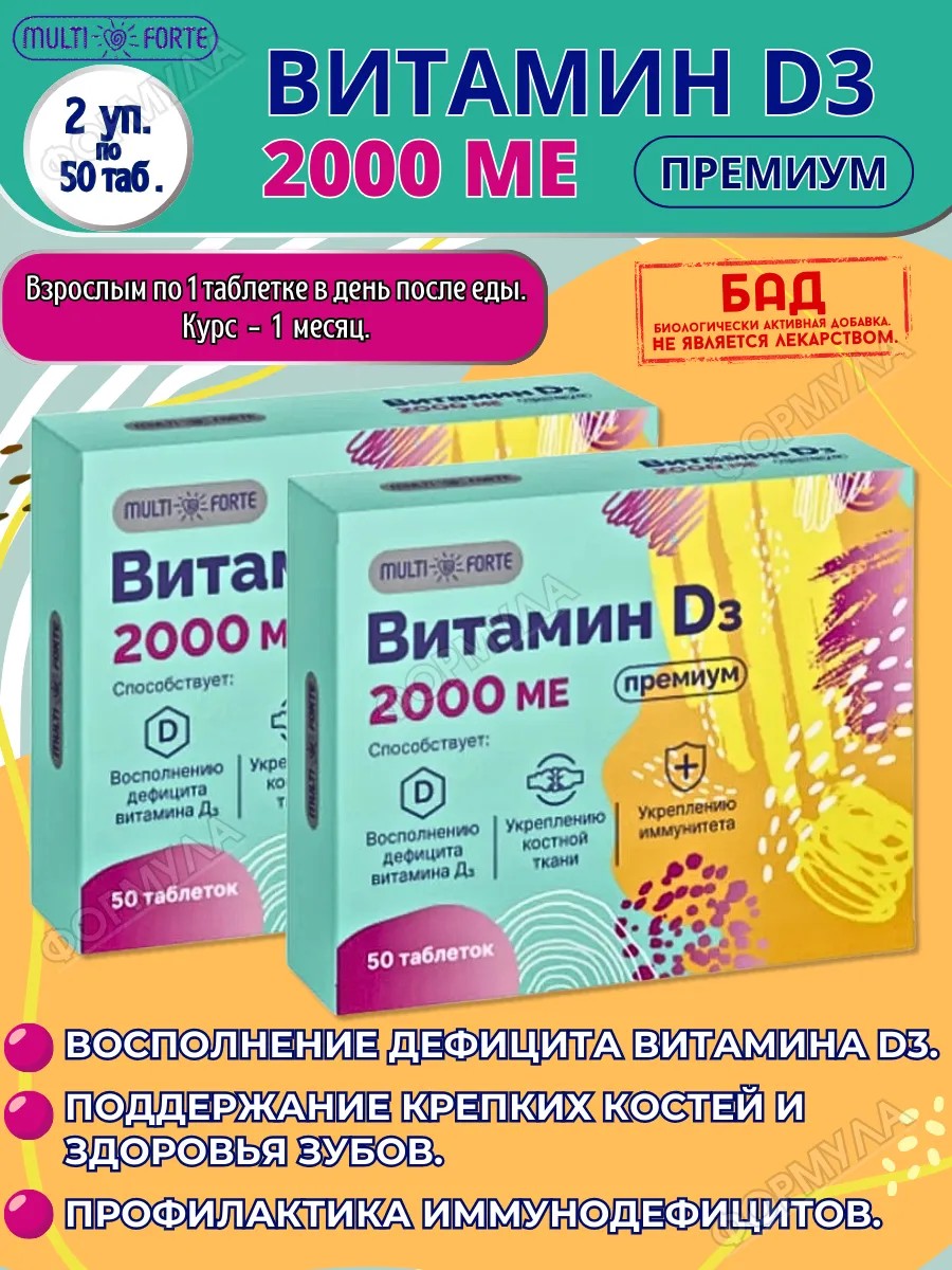 | Package contents | Vitamin D3 Premium MultiForte tablets 2000 IU x50; 2 packs |