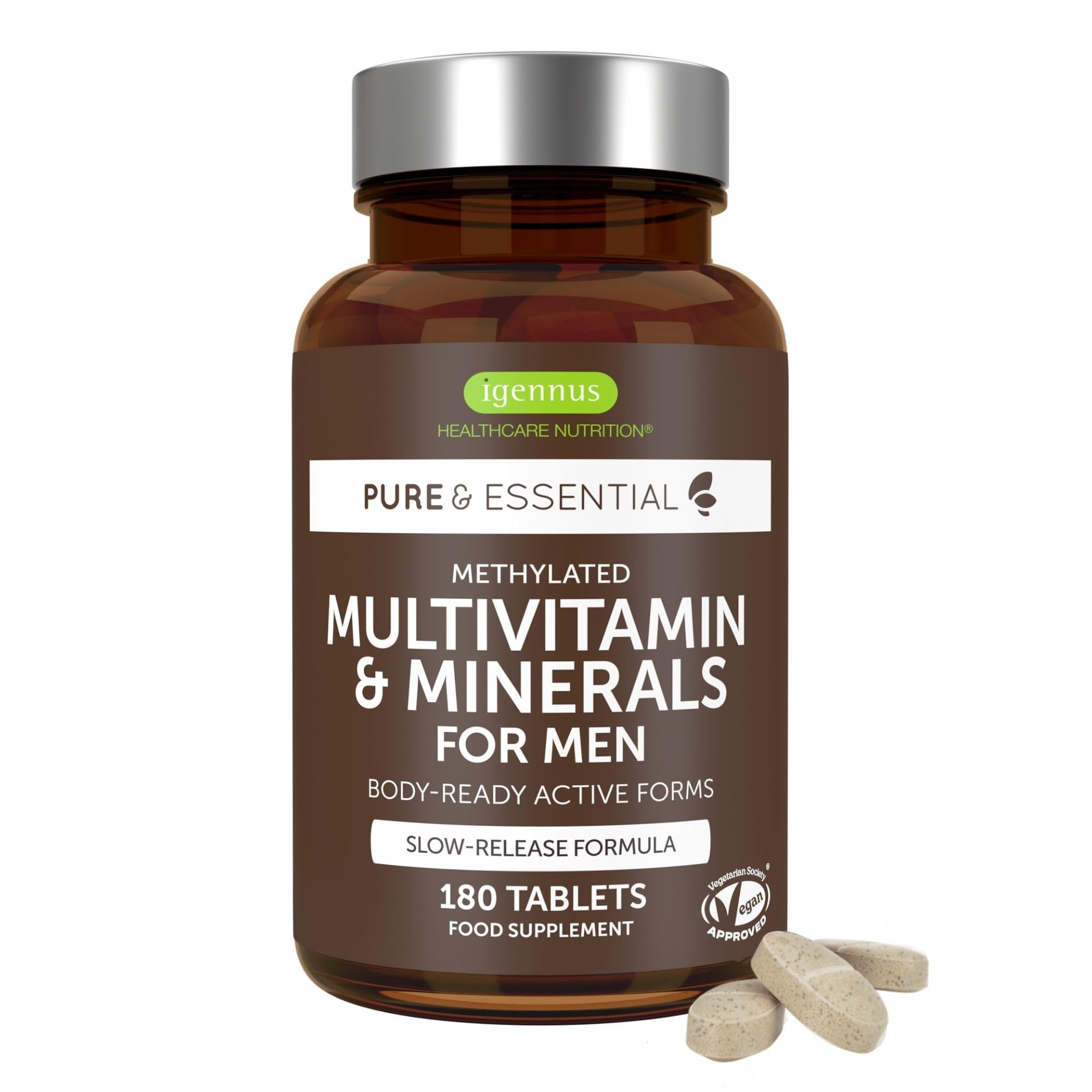 MADE IN THE UK TO GMP STANDARDS: lab-verified ingredients, vegan, fully recyclable packaging, BPA-free plastic bottle. SUPPLEMENTED WITH ACTIVE MINERAL FORMS: fully reacted zinc is balanced with copper in glycinate form for enhanced absorption. ACTIVE B VITAMIN COMPLEX: methylfolate, as [6S]-5-methyltetrahydrofolate riboflavin-5-phosphate vitamin B6 as pyridoxal-5-phosphate vitamin B12 as methylcobalamin vitamin B7 as D-biotin with cofactor activity. SLOW-RELEASE HIGH-ABSORPTION FORMULA: optimal nutrient levels with bioactive vitamin forms and slow release. Complete nutrient coverage throughout the day to effectively boost vitamin and mineral status. COMPLETE MULTIVITAMINS FOR MEN: 22 key nutrients enriched with lycopene, vitamin D, methylated B-vitamin complex, and zinc, to support energy, immunity, hormones, mood, heart and prostate health. Iron-free.